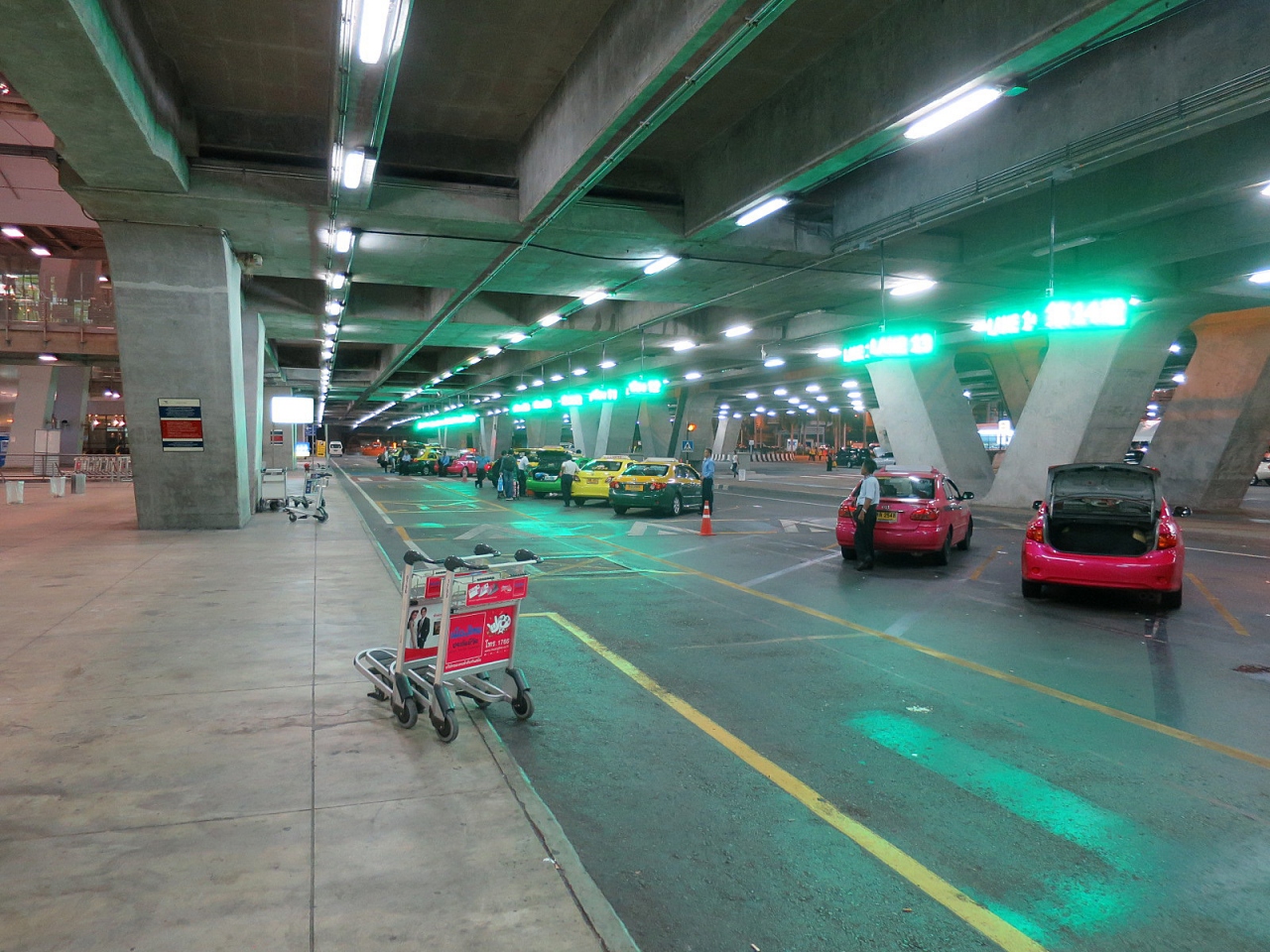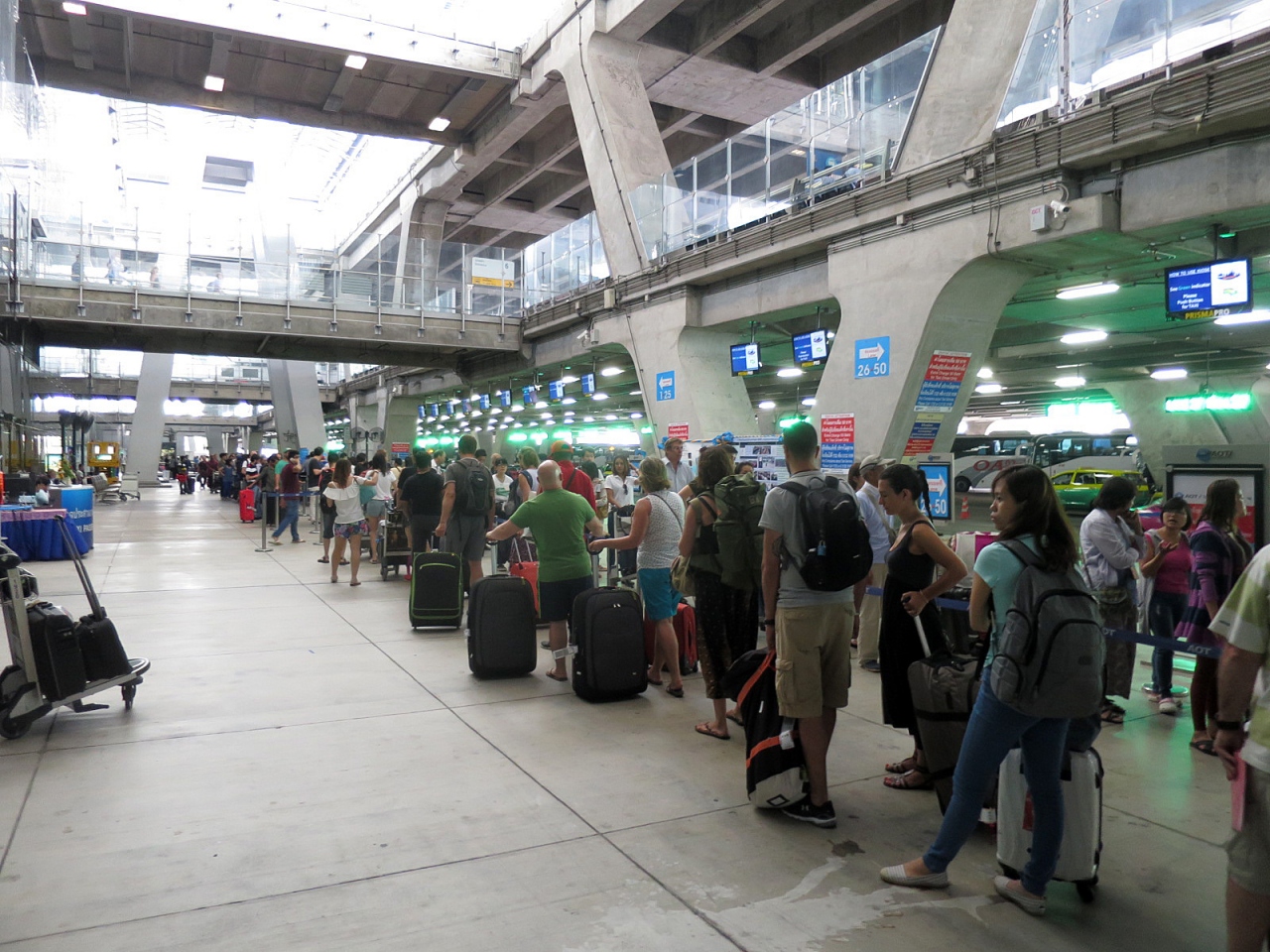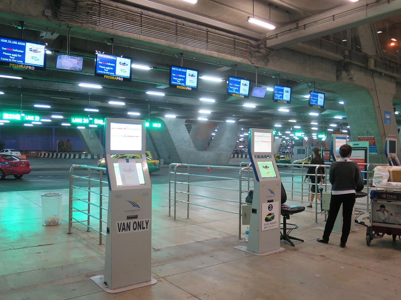 年末にスワンナプーム国際空港をおとずれたとき、タクシー乗車のシステムが変更されていましたが、今回もそのままのシステムで運営されていました。それぞれのタクシーの駐車ブースの天井には数字が表示された電光掲示板があります。タクシー乗り場に設置された発券機のボタンを押し、出てきた整理券に記されている数字のスポットに停車しているタクシーに乗車することになります。タイらしく、ちゃんとボタンを押す係の人がいたりしますから、発券機を設置する必要はあるのでしょうか…(笑)。今回出て来た整理券に記された番号は10番レーンで、20メートルくらい歩くことになりました…面倒です。かつてのように英語で告げた行先をタクシードライバーに伝えるカウンターブースがなくなったので、タイ語を話せない人はタクシードライバーに正しく行先を告げることが難しいのではないでしょうか。タイ語で行先を書いたメモを準備しておくことが必要になるでしょうね。その数日後、初めて日中のタクシー乗り場に向かうと、今まで見たことのないほどの長い行列。素直に電車でバンコクに向かいました。