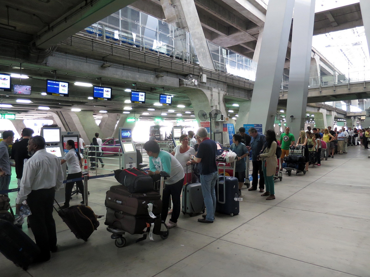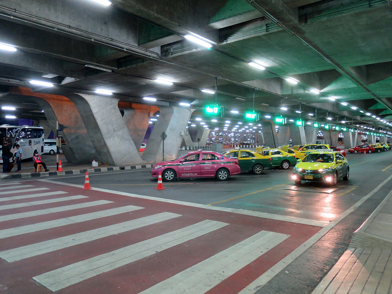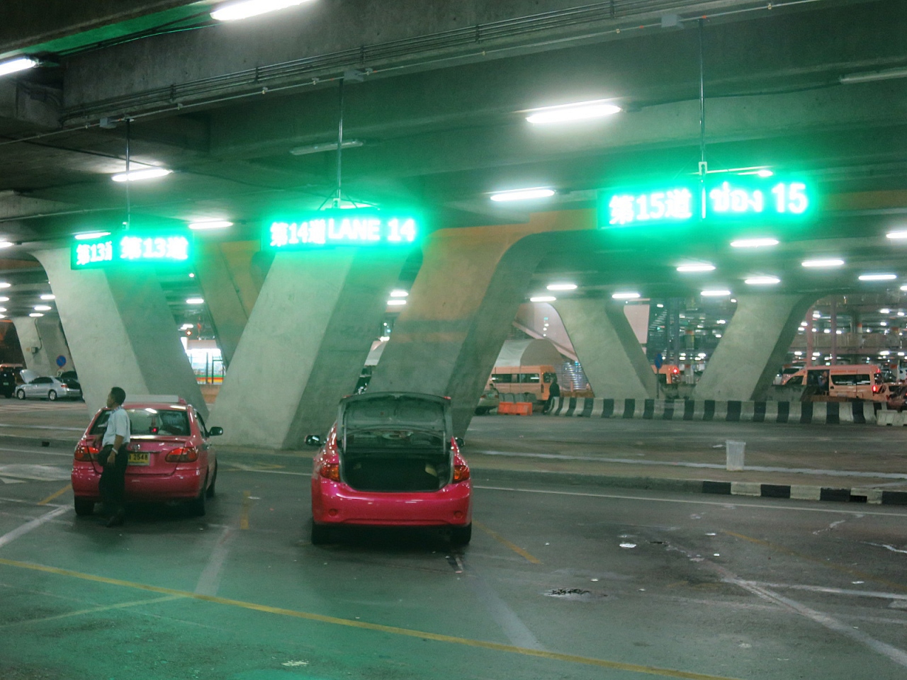 年末にスワンナプーム国際空港をおとずれたとき、タクシー乗車のシステムが変更されていましたが、今回もそのままのシステムで運営されていました。それぞれのタクシーの駐車ブースの天井には数字が表示された電光掲示板があります。タクシー乗り場に設置された発券機のボタンを押し、出てきた整理券に記されている数字のスポットに停車しているタクシーに乗車することになります。タイらしく、ちゃんとボタンを押す係の人がいたりしますから、発券機を設置する必要はあるのでしょうか…(笑)。今回出て来た整理券に記された番号は10番レーンで、20メートルくらい歩くことになりました…面倒です。かつてのように英語で告げた行先をタクシードライバーに伝えるカウンターブースがなくなったので、タイ語を話せない人はタクシードライバーに正しく行先を告げることが難しいのではないでしょうか。タイ語で行先を書いたメモを準備しておくことが必要になるでしょうね。その数日後、初めて日中のタクシー乗り場に向かうと、今まで見たことのないほどの長い行列。素直に電車でバンコクに向かいました。
