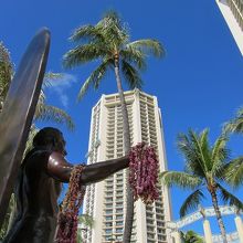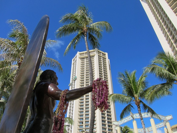 オアフ島を訪れた人なら ほぼ100%が訪れるであろうワイキキビーチに立つ デュークカハナモク像。