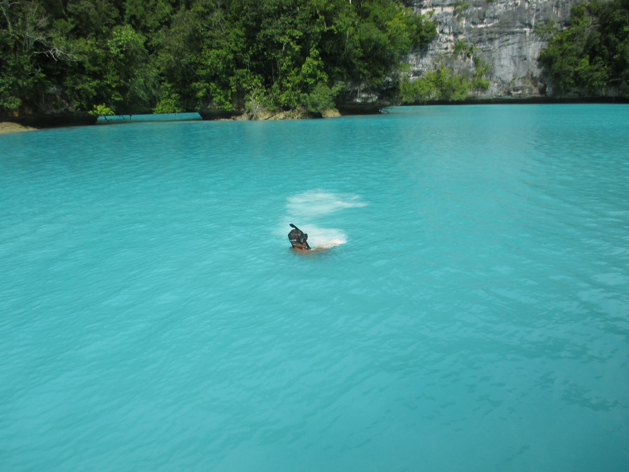頭のテッペンから足の先まで、全身真っ白に包んだあとは、海に飛び込んできれいに流しましょう。