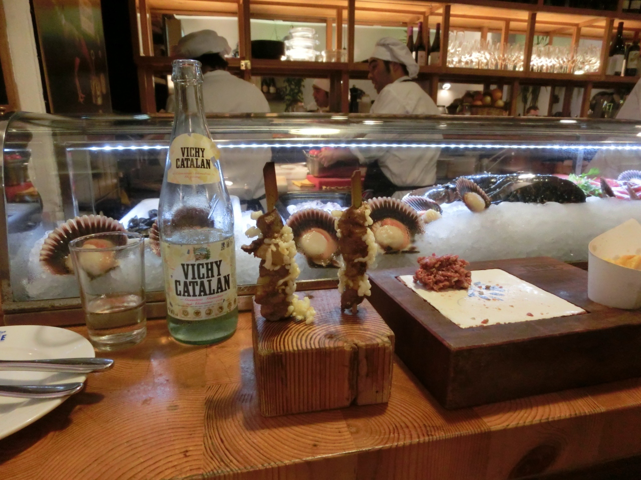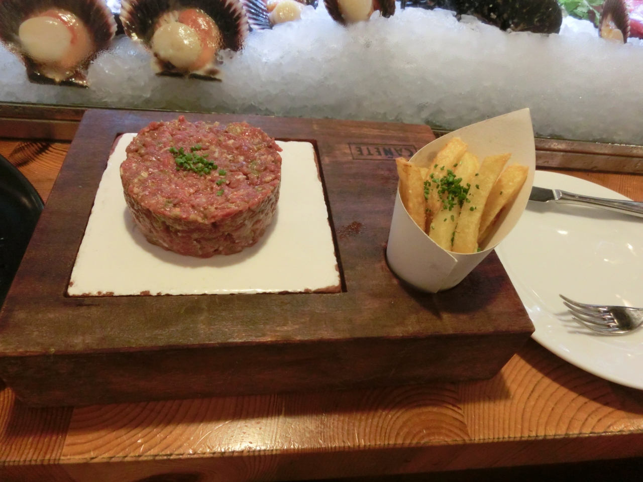 日本語メニューはありましたが、出てきたお皿とはイメージが異なります。牛肉のタルタルステーキ、豚肉の串焼き?、シーチキンのタルタル、ロシアンサラダを食べ、飲み物(ソフトドリンク、ビール)あわせて2人で総額35ユーロでした。