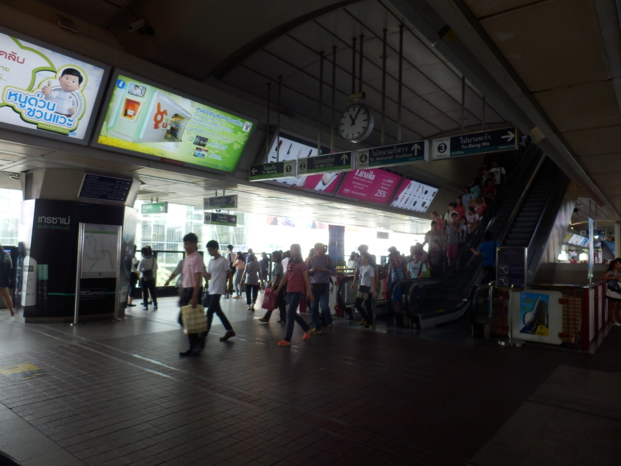 BTSのスクンビット線とシーロム線が交わる乗換駅です。ホームは二階建てになっていて、それぞれの路線の上下線が隣り合っているので、例えばスクンビット方面からウィークエンド・マーケットへ行く際には正面に停ま る列車に乗り換えるだけなので簡単です。