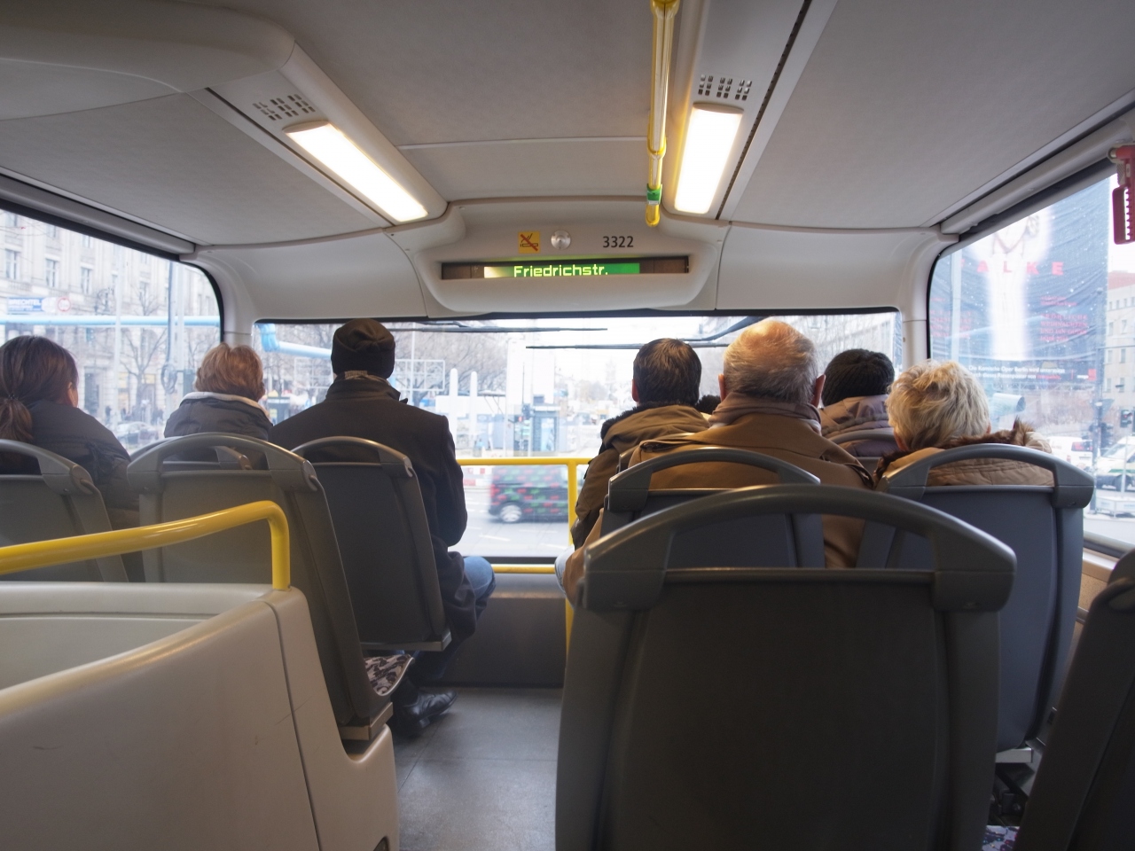ベルリン市内を走る黄色いバス。路線網など旅行者に少々分かりにくいですがスマホを持参していればグーグルマップの活用で乗るべき路線や、おおよその時刻まで表示してくれ活用することができます。とくに二階建ての100番、200番のバスは観光地を巡っていて使い勝手が良いです。