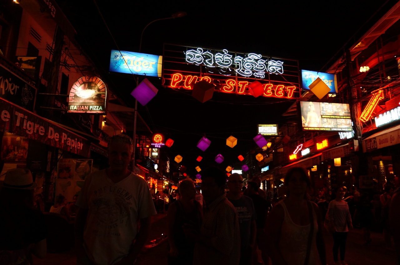 シェムリアップの街中にあるナイトマーケット。道路の上にナイトマーケットと書いてある看板が光っているのですぐ分かります。空港よりは安いのでお土産を買うのにはいい。何件もないとマーケットがあるので迷います。