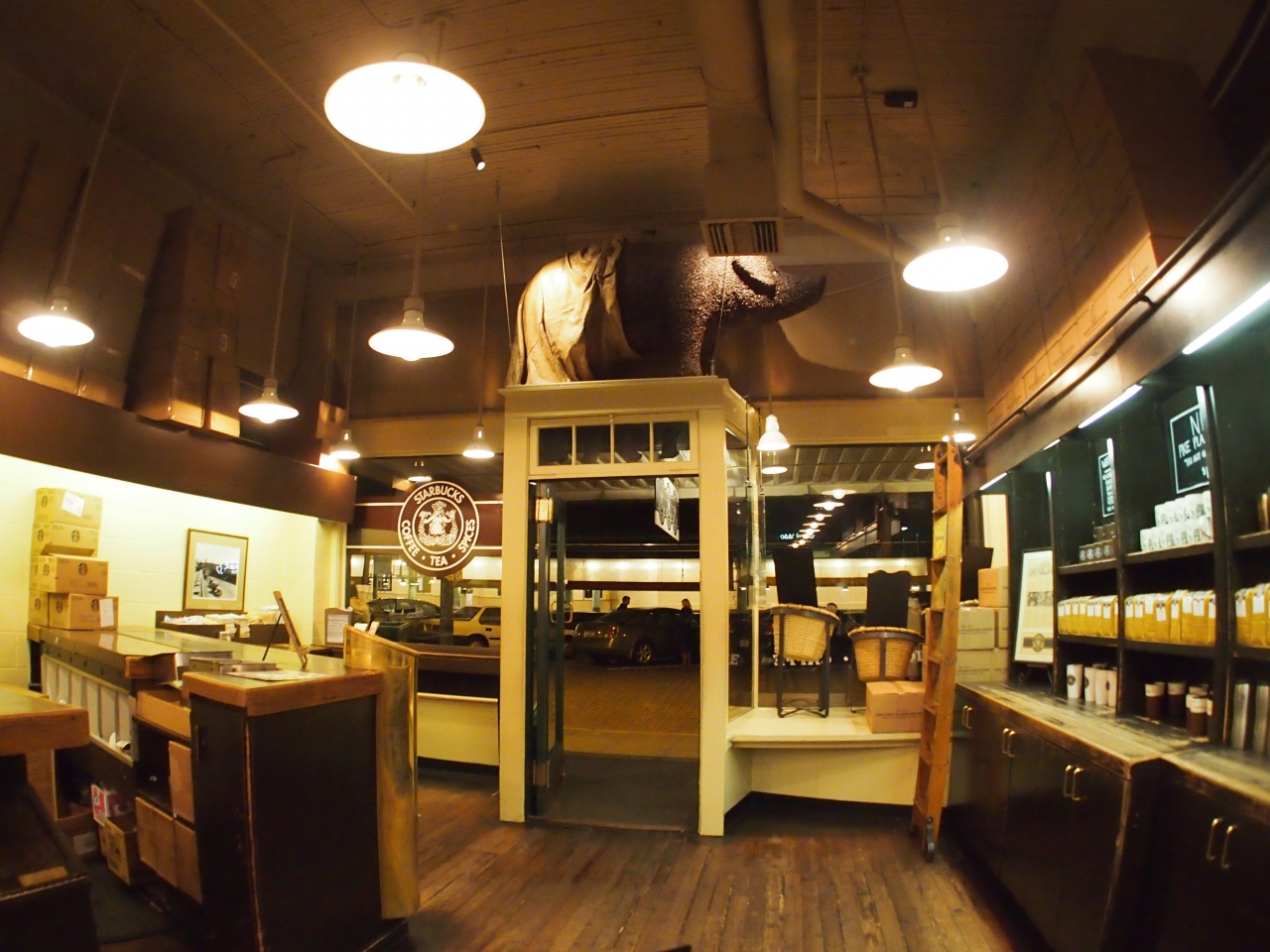 終日、激混みとの噂を聞いていましたが夜20:00前後だとほとんど人がいなかった。ただし周辺の治安としては雰囲気は良くなかったのでタクシーがオススメ。コーヒーはもちろんどこで飲んでも同じ味。お目当ての1号店グッズは品揃えが少なく残念でした。