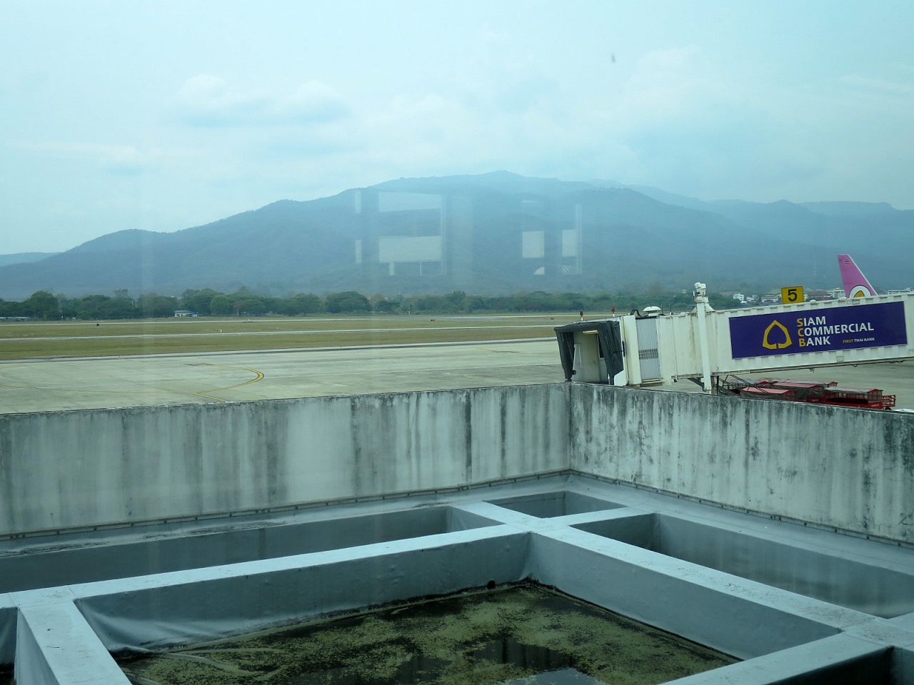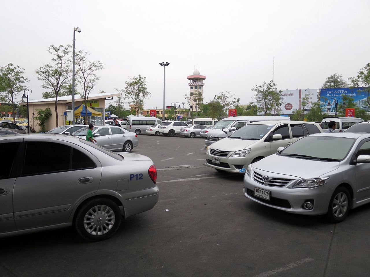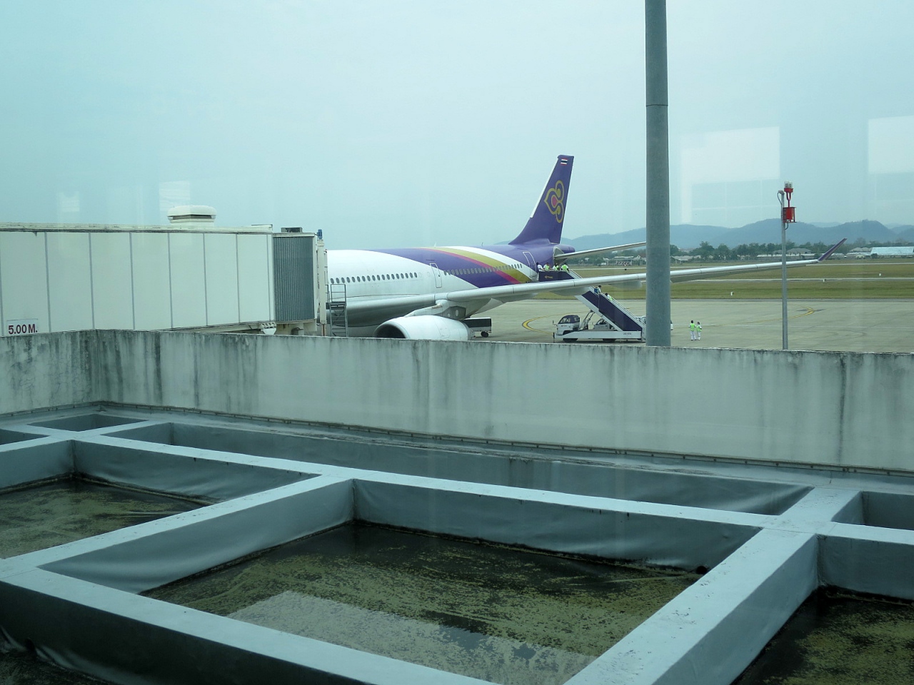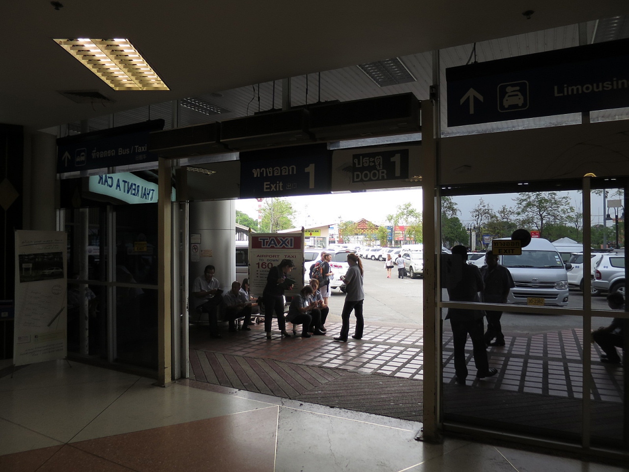 バンコクからタイ国際航空を利用してチェンマイ国際空港に到着しました。到着スポットから出口に向かう通路からはドイステープが見られ、「チェンマイに着いたなぁ」との実感がわきます。タイ屈指の観光地のチェンマイですからフライトも多いのですが、空港ターミナルは小ぶりで、預け入れた手荷物を受け取るターンテーブルも3台のみですから、混みあうこともあるでしょうね。手荷物受取場に着くと、右手には各種パンフレットの置かれたスペース、トイレ前には携帯電話の無料SIMを配布するテーブル、またメータータクシーとエアポートタクシーの窓口があり、そちらで手続きをしてバウチャーをもらうこともできますが、窓口は受取場の外にも開けていますので、そちら側でも手続きができます。さて荷物を受け取って制限区域を出ると、左手には先ほどのタクシーの窓口があり、そこから目と鼻の先が空港出口で、そこは駐車場にもなっています。その空港出口にはエアポートタクシーのお姉さんが待ち構えており、そのお姉さんに行先を告げると、乗車タクシーが指定され、そのタクシーの運転手に車まで案内されます。エアポートタクシー駐車場の奥がメータータクシーの駐車スペースで、そちらを利用する人は、そこまで自分で歩いて行くことになります。