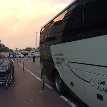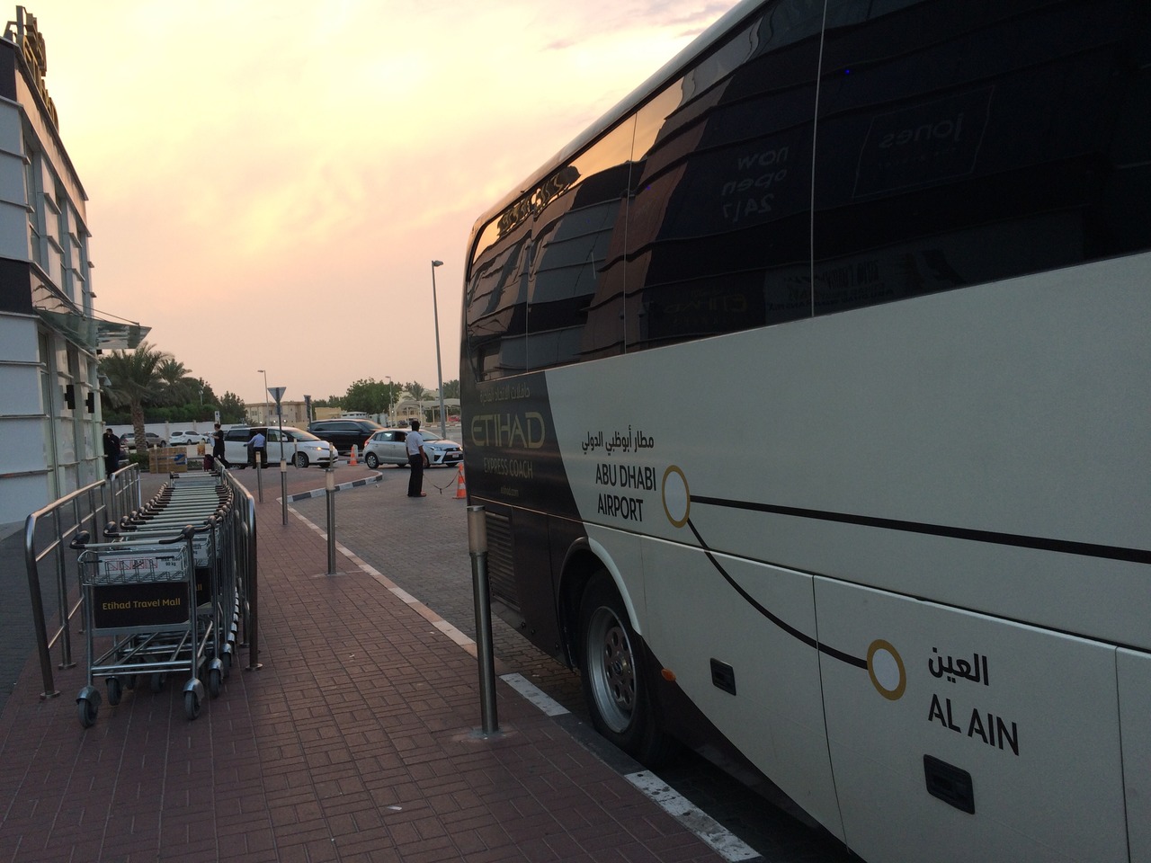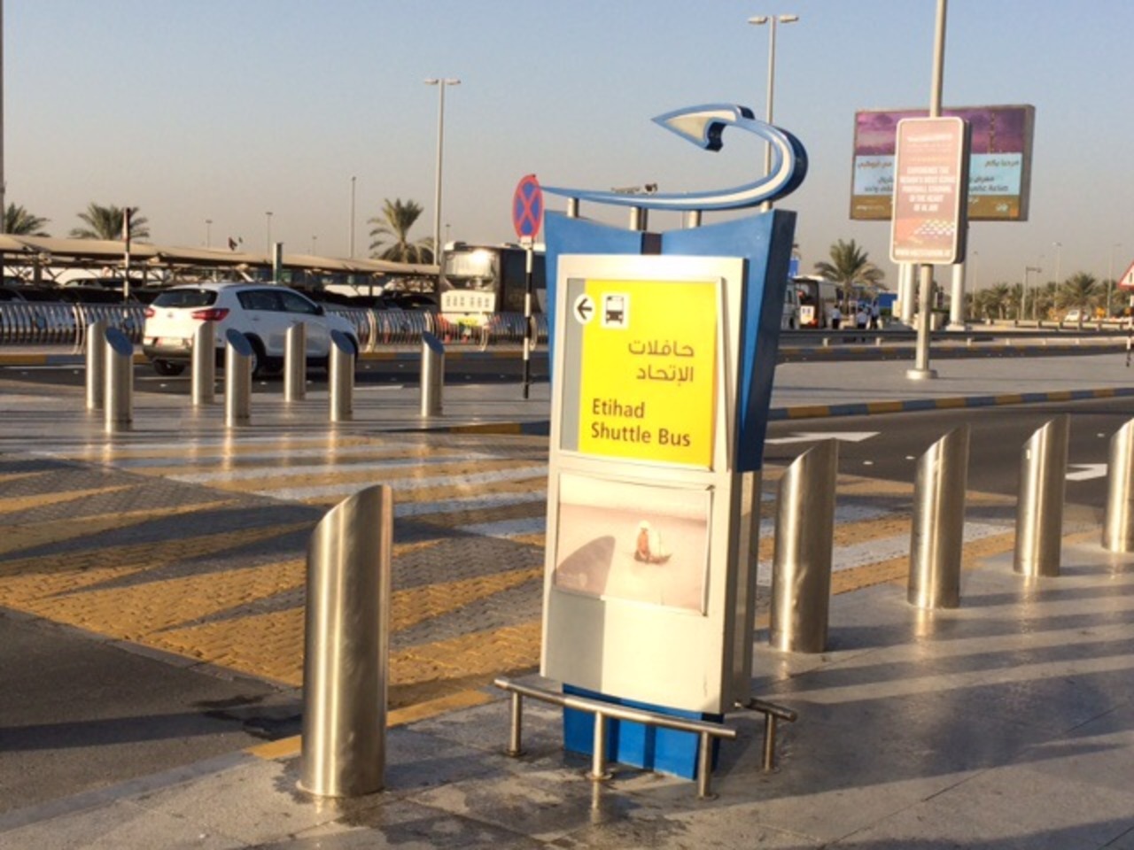 アブダビ空港の バス乗り場は少しわかりにくいですが 外に出て右方向に行くと 黄色い看板があります。