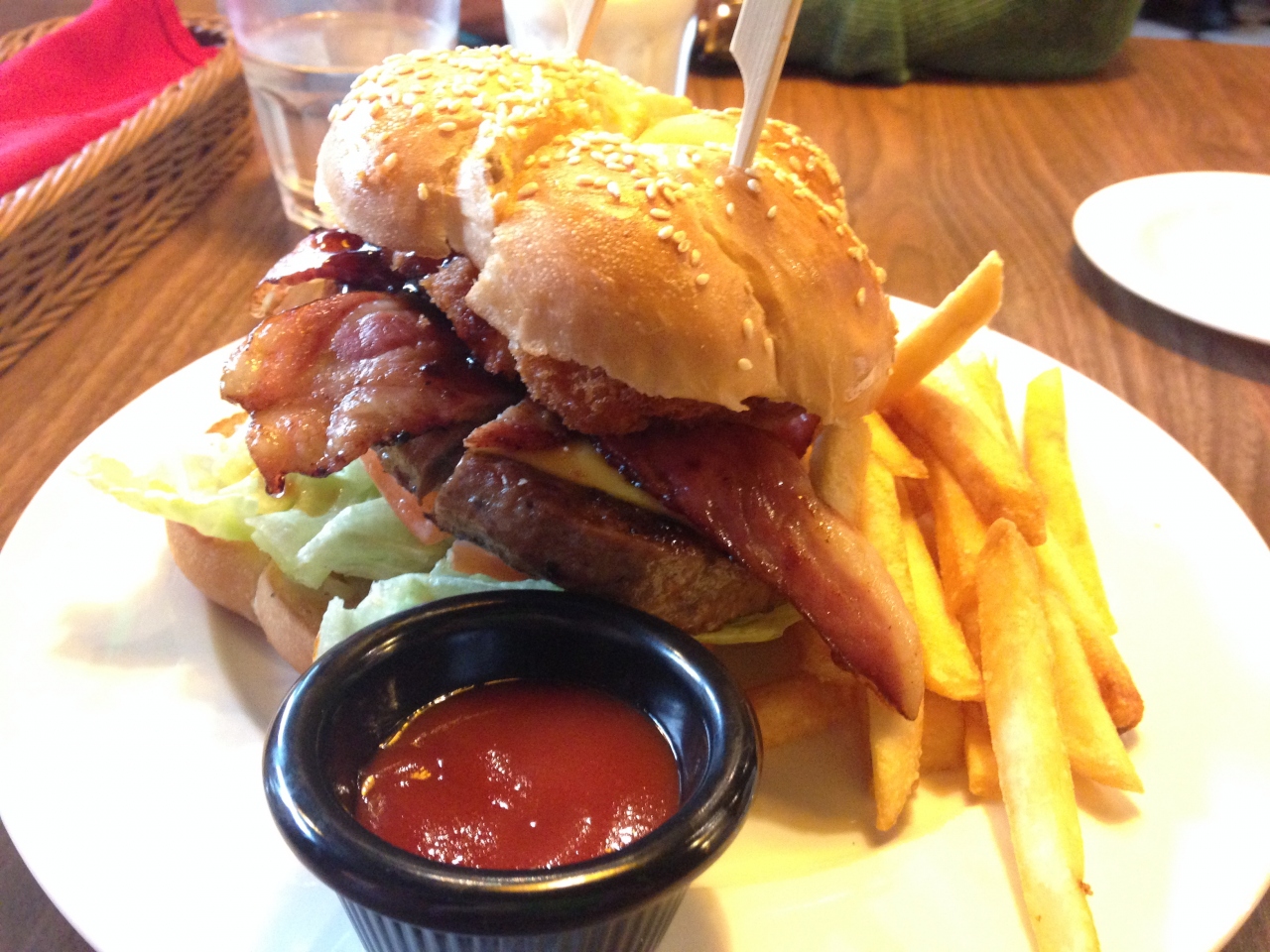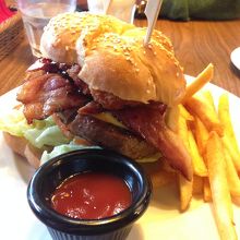 ハンバーガーはものすご~く大きくて、それが半分にカットされて出てきます。ポテトフライも付いていてボリューム満点で見た目からも満足感がハンパないのですが、一つ残念なことが…。肝心のハンバーグが昔懐かしい「石井のお弁当君のハンバーグ」のような感じでお肉らしさが感じられませんでした。これならフィッシュバーガーのようなものを頼んでみれば良かったかなと思いました。