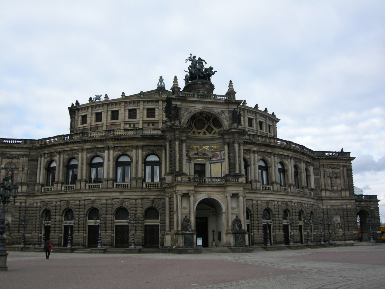 団体ツアーでドレスデンを観光した際に外観のみ観ました。19世紀の劇場建築家、ゼンパーさんによって建てられたものです。2度の焼失から再建され1985年に今のような姿になっています。シンメトリーの外観はとても重厚で、黒っぽく変色した石のせいで実際以上に歴史を感じさせてくれます。