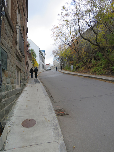 旧市街を一通り歩き回ろうとすると、かなりの急坂や階段を登ったりすることになります。けっこうしんどかったですが、石畳の落ち着いた街並みや、悠然と流れるセント・ローレンス川を見下ろしながらの散策はとても楽しいです。また10月末だったので市庁舎前にはハロウィンの大きな飾りがあったりして、たくさんの観光客がカメラを向けていました。