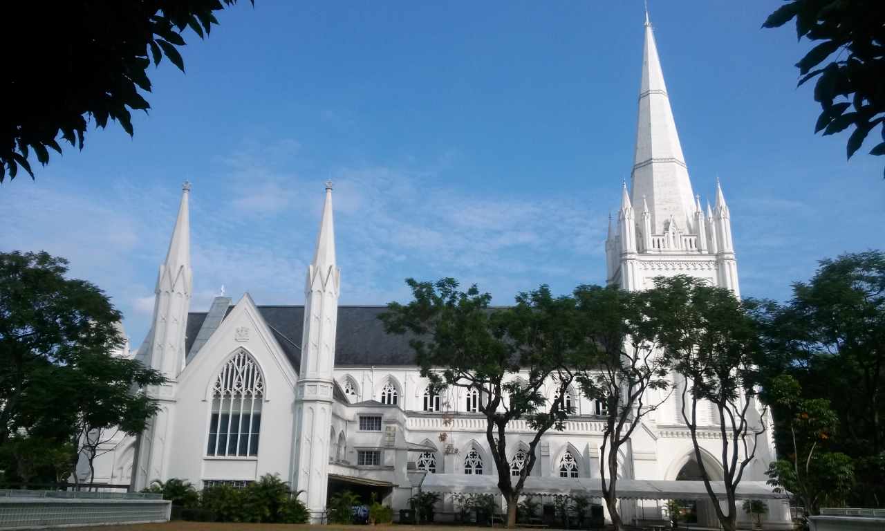 シンガポール中心部の中央に位置し、セントアンドリュース大聖堂は、白い色が目立つ建物です。