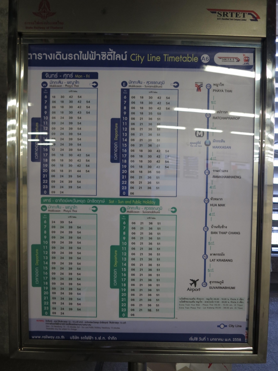駅で確認したところ,エクスプレスは運休中でシティーラインのみの運行。15分間隔でした。空港まで35B(パヤー・タイからなら45B)。