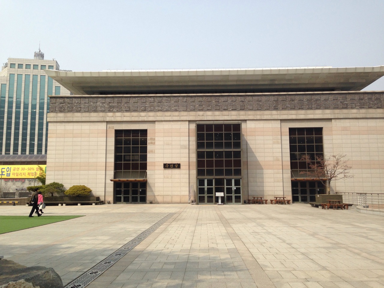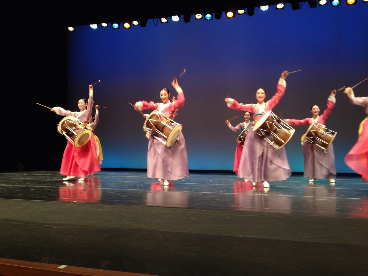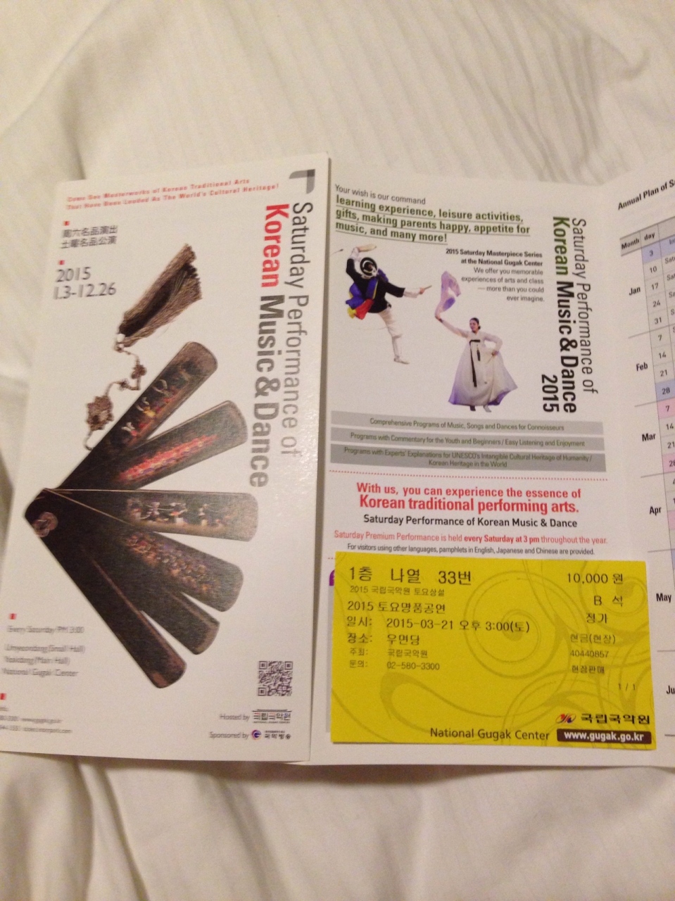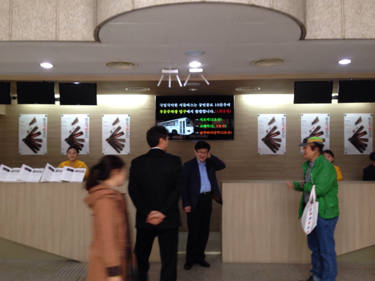 予約しておかないと席が取れそうにない…しかもハングル…ということでなかなか敷居の高かった土曜コンサートですが、今回、土曜朝にホテルのフロントに電話してもらい予約することができました。地下鉄南部ターミナル駅5番出口を出たところにマウルバス乗り場があり、22番に乗ると国楽院前に着きます。大きな劇場で看板が出ているのでわかりやすいです。7,8分くらいです。15時開演で14時にならないとチケットは買えません。あまり外人はいないようでしたので予約なしでも入れそうでした。料金はW10,000とw12,000.安い方は一番前です。小さい会場なので、一番前は臨場感たっぷりでした。周りにもっと大きな劇場、その中にカフェ。こちらの劇場では有名な方のコンサートがあります。気に入ったらこちらも楽しめますね。夕方からの開演になっていました。博物館もあります。自由に楽器を使って良いところが野外にあり子供達が割と上手に使っていました。劇場の上の方は遊歩道になっていて市民の憩いの場かも。コンサートは民族楽器の演奏や歌、踊りを1時間20分ほど楽しませてくれます。写真は撮れませんが、最後に時間を取ってくれます。アナウンスや字幕(英語)を、みのがさないやうに!あまり関心のないけど、少しは知っておきたいと思う人にオススメです。帰りはシャトルバスが駅まで連れて行ってくれます。教育大前の駅にも行くので便利です。