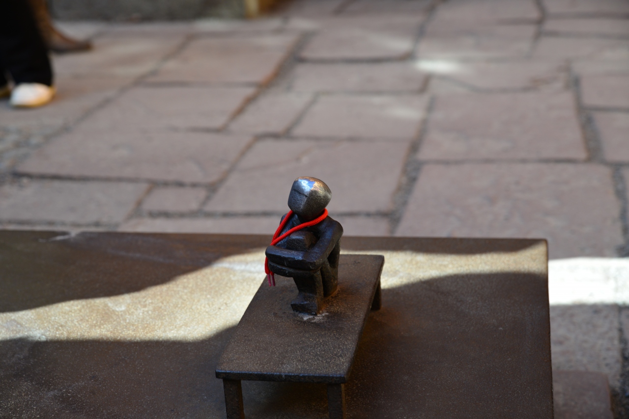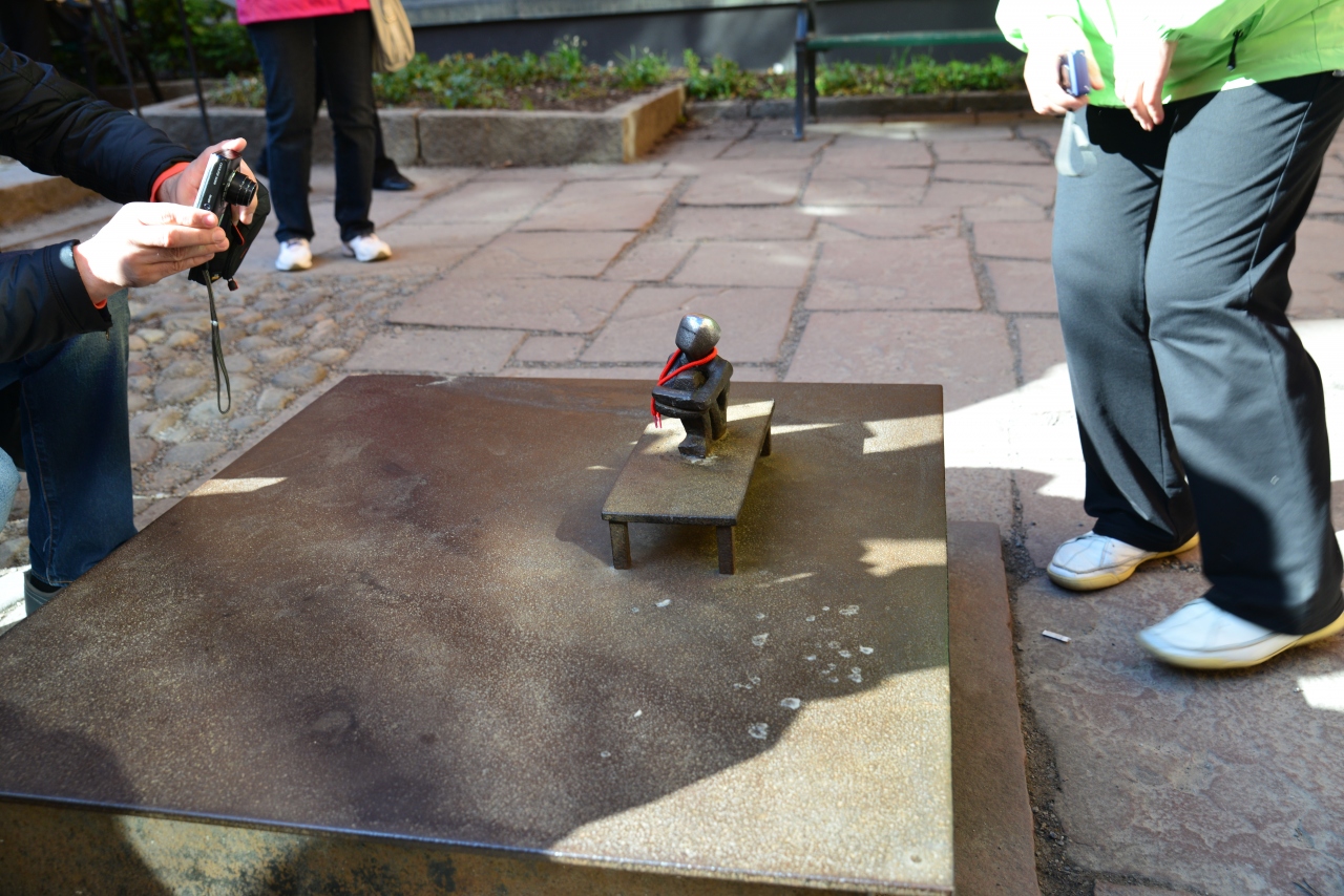頭を撫でると幸せになるということで、頭は撫でられてピカピカに。朝早かったのでお賽銭やお供え物(?)のようなものは置かれていませんでしたが、赤いマフラー(?)でしょうか、首のまわりにかけられていました。みんな「かわいい!」と写真をパチリパチリ。