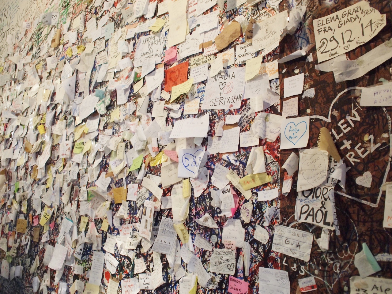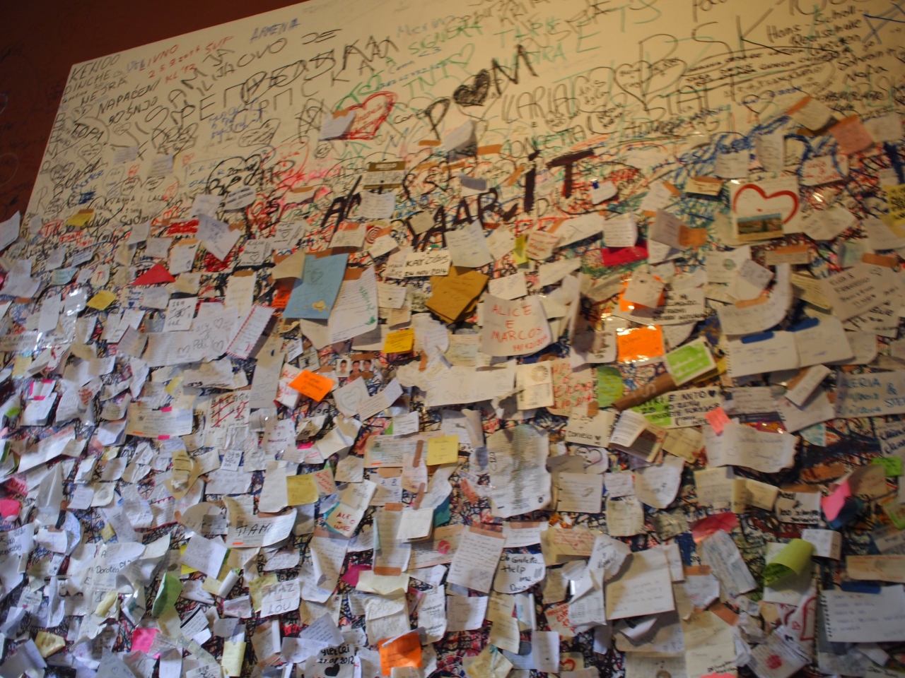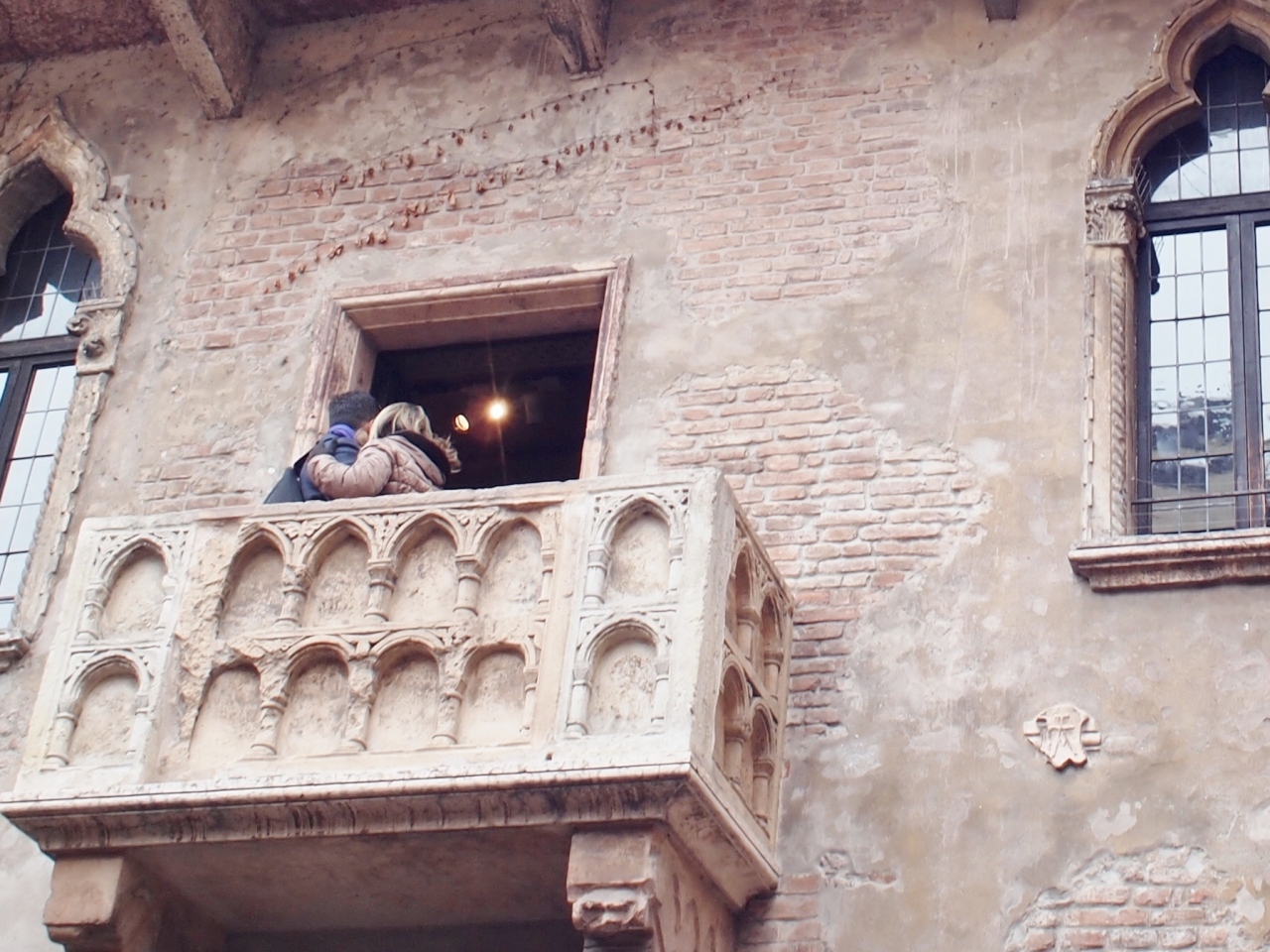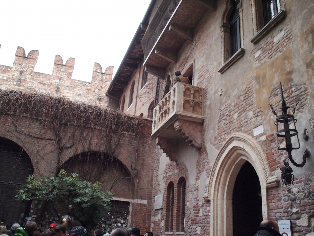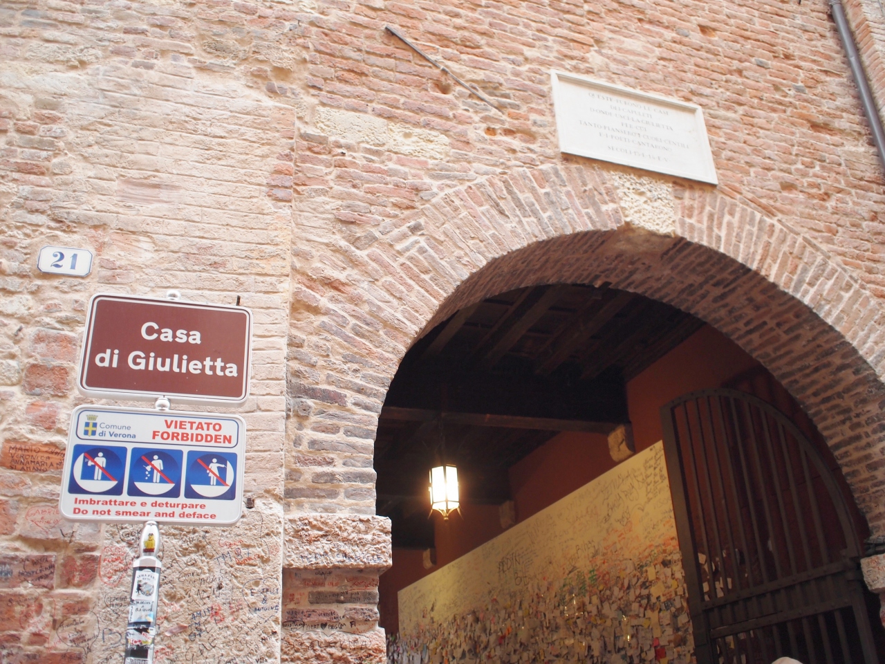 ヴェローナの一番有名な観光地の一つです。門を入ると世界各地からジュリエッタに届けられた愛の悩みを綴ったような手紙が一杯貼り付けられています。映画にもなっているようで、ちょっと感動でした。一番のメインはジュリエッタ像との記念撮影や、バルコニー見物。バルコニーのある建物に入るのは有料ですが、中庭の無料部分だけでも、銅像と記念撮影が出来たり、バルコニーを眺めたり出来て面白かったです。記念グッズも売られていました。