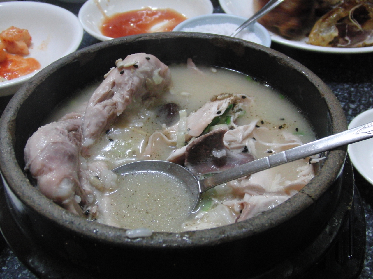 いよいよ参鶏湯登場 グツグツ煮立ったスープは濃厚で旨みが凝縮されている感じ、 好みによって塩や胡椒で味を調整して食べる。肉を取り出して塩をつけてたべても美味。朝鮮人参もドーンと入っているし 絶対身体にいいよね。
