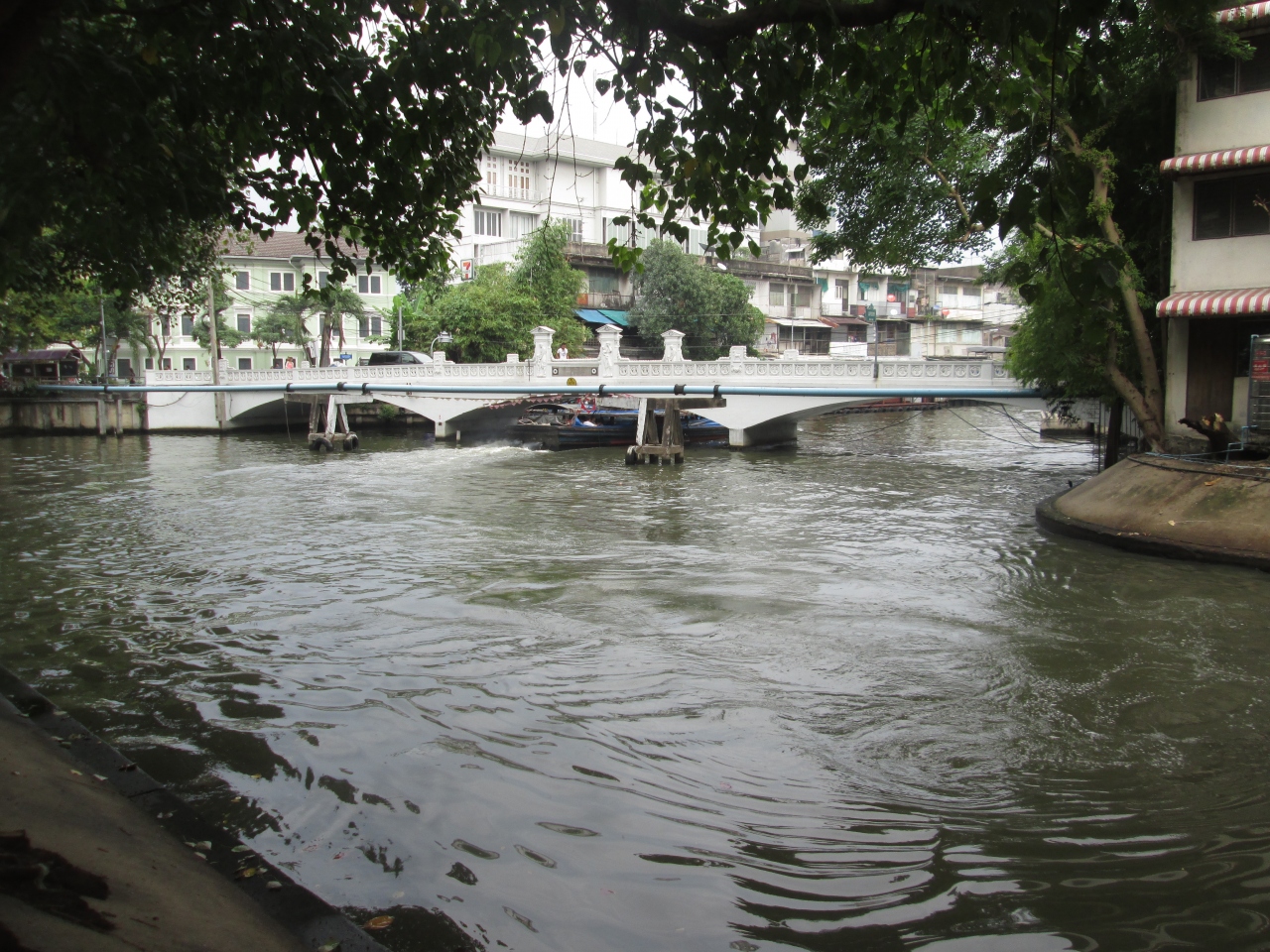 マハカーン砦近くのパーンファー・リーラート船着き場付近にある白い橋です。プラトゥーナーム行きの運河乗合ボート・西路線のボートが通過する橋でもあります。ボートが橋の下をすれすれに通過する貴重な光景を見かけました。