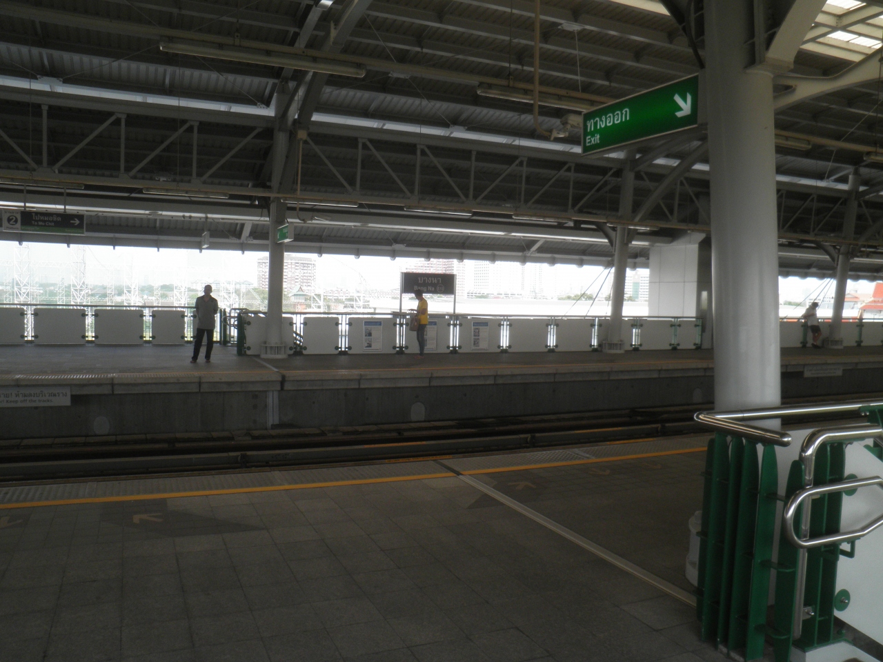 バンコク高架鉄道BTSに乗って、バンナー駅へ行きました。 次の駅は終点のベリング駅で、プラットフォームからタイの国旗がはためくビルが見えました。 ここらへんまでくると、駅の周囲には樹木が多いように思います。 わりと新しい駅で、オンナット駅より東側はちょっと運賃が安めになっているようでした。