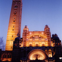 赤レンガと白の縞模様が特徴的な外観が目を引くビザンティン様式の大聖堂です。ちょうどミサが始まったので写真は撮影できませんでしたが、どの席からも見えるようにと祭壇が高い所にあり、その上に掲げられた大きな十字架にはりつけにされたイエス・キリスト像はこちらに迫ってくるような迫力がありました。また、日が沈むと建物がライトアップされ、昼間とは違う美しさが夜の闇に浮かび上がっていました。