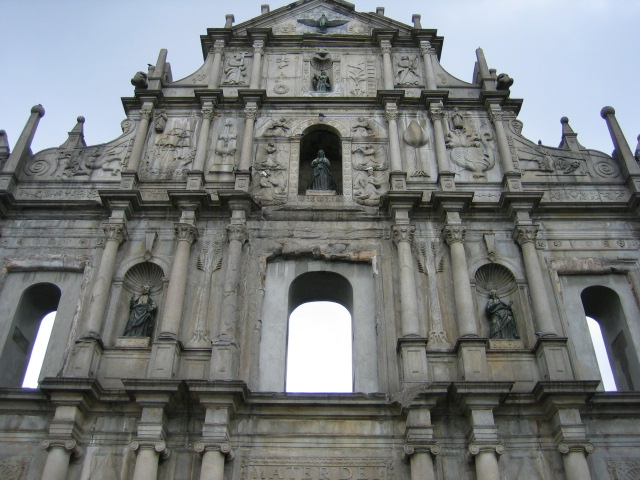 セナド広場から案内に沿って歩いていると突然姿を現わして感動する。正面の壁しか残っていないがいろいろなキリスト教ゆかりの彫刻が施されていて見ていて楽しい。裏の土の下には建造物跡も残っている。セナド広場からここまでの間にお土産屋さんがたくさんあってマカオ観光のメインになるだろう。