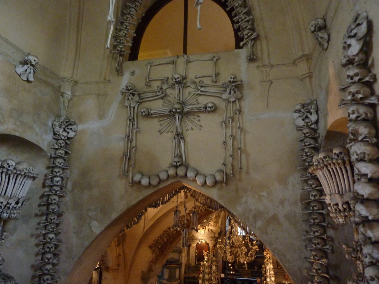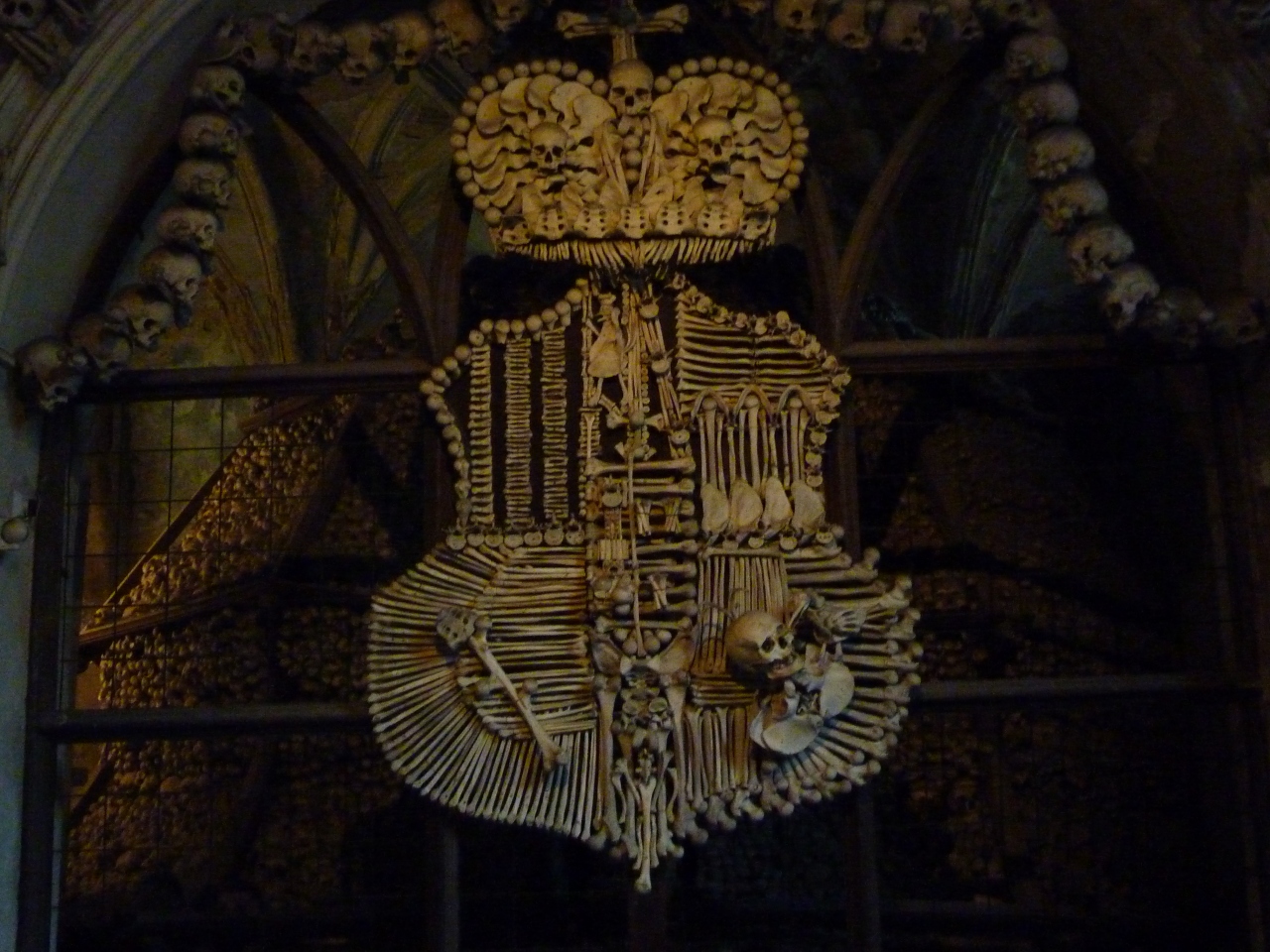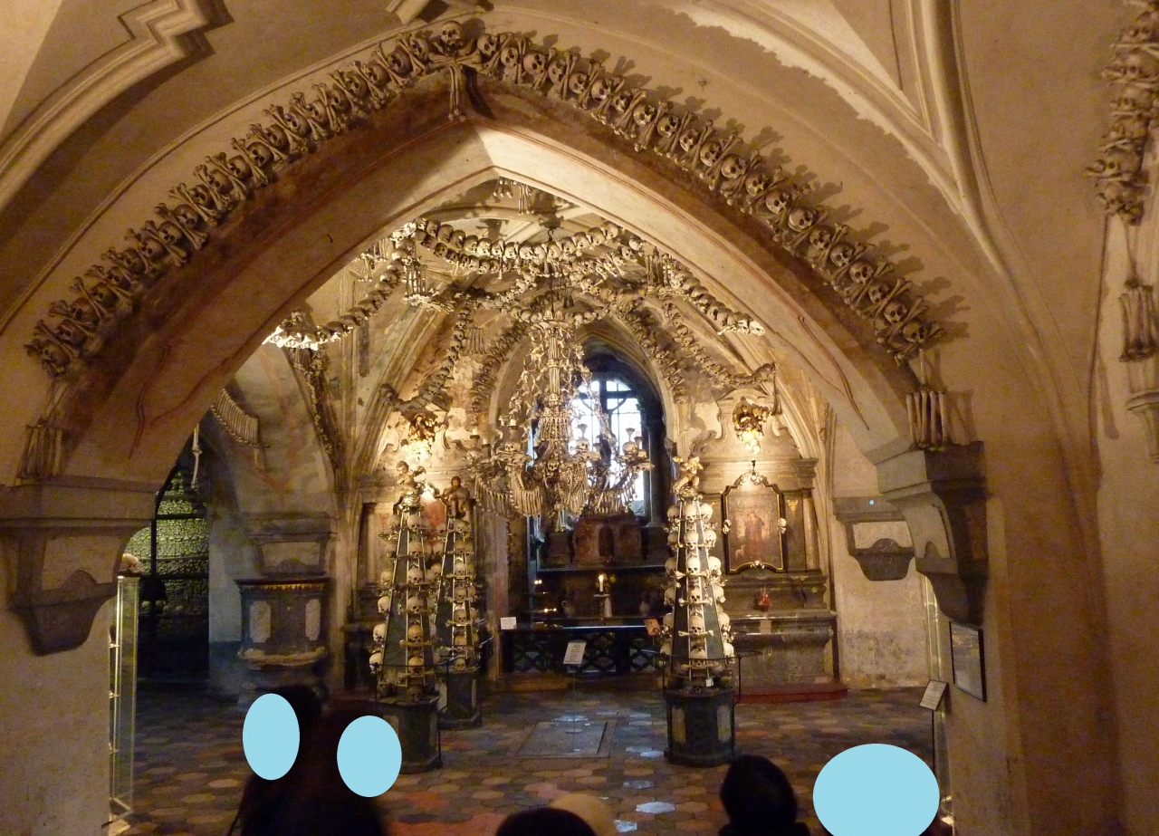 墓地を抜けた所に在る教会ですが、入った途端にひんやりした空気を感じてしまいます。壁に飾られたシャレコウベを積み上げた山、天上から吊り下げられたシャンデリアも人骨でできており、天井から万国旗のように吊り下げられた人骨、塔を模った飾り、紋章まで全て人骨で出来ています。15世紀に蔓延したペストで亡くなった約3万人や宗教戦争で犠牲になった人々の骨が使われているそうです。