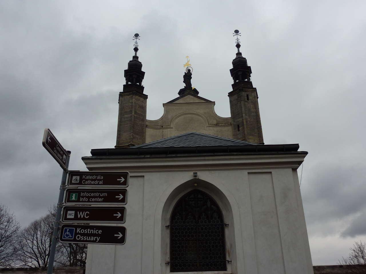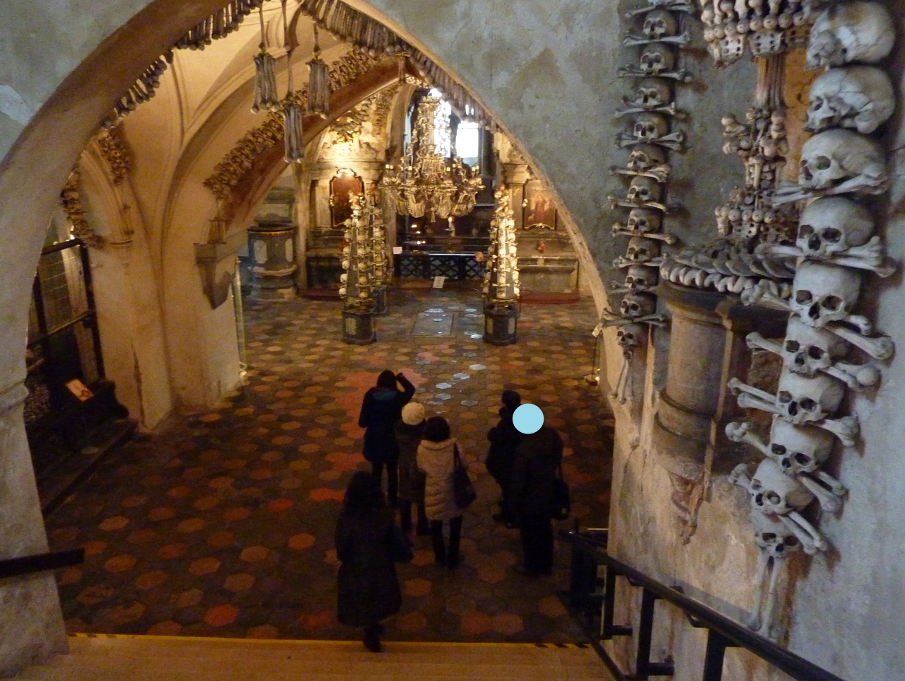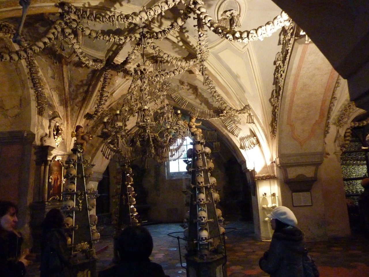 墓地を抜けた所に在る教会ですが、入った途端にひんやりした空気を感じてしまいます。壁に飾られたシャレコウベを積み上げた山、天上から吊り下げられたシャンデリアも人骨でできており、天井から万国旗のように吊り下げられた人骨、塔を模った飾り、紋章まで全て人骨で出来ています。15世紀に蔓延したペストで亡くなった約3万人や宗教戦争で犠牲になった人々の骨が使われているそうです。