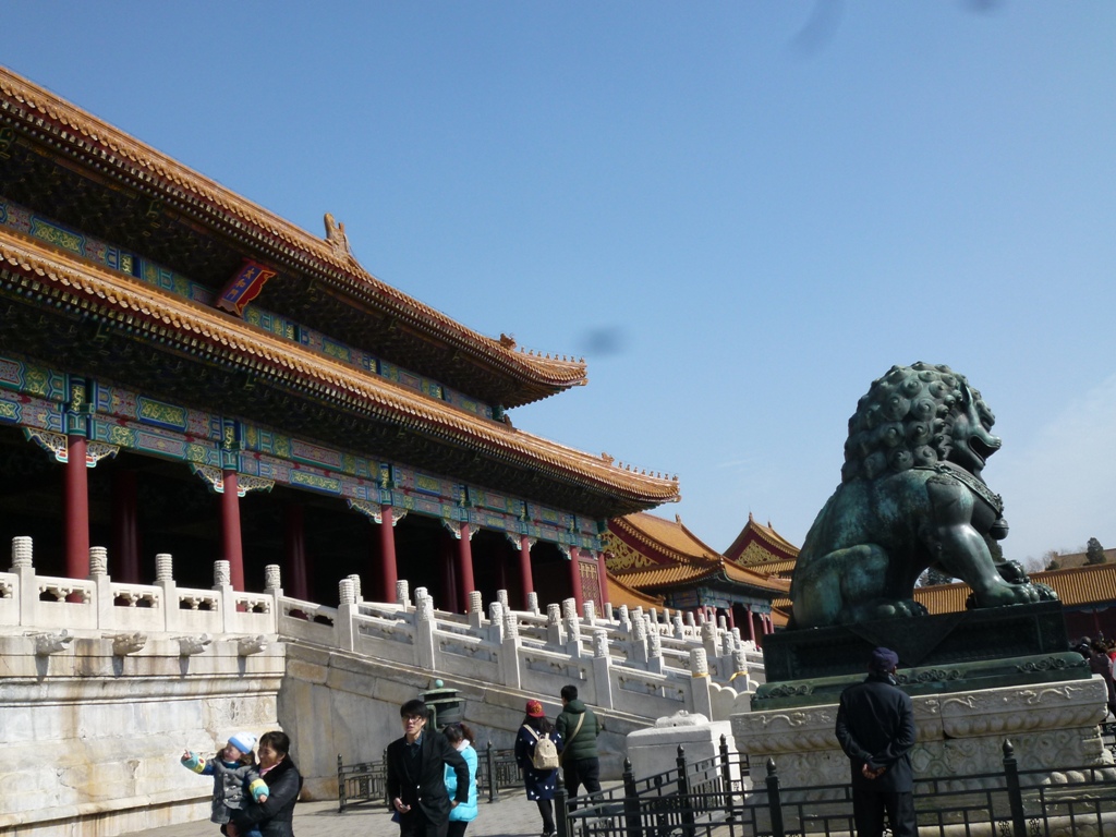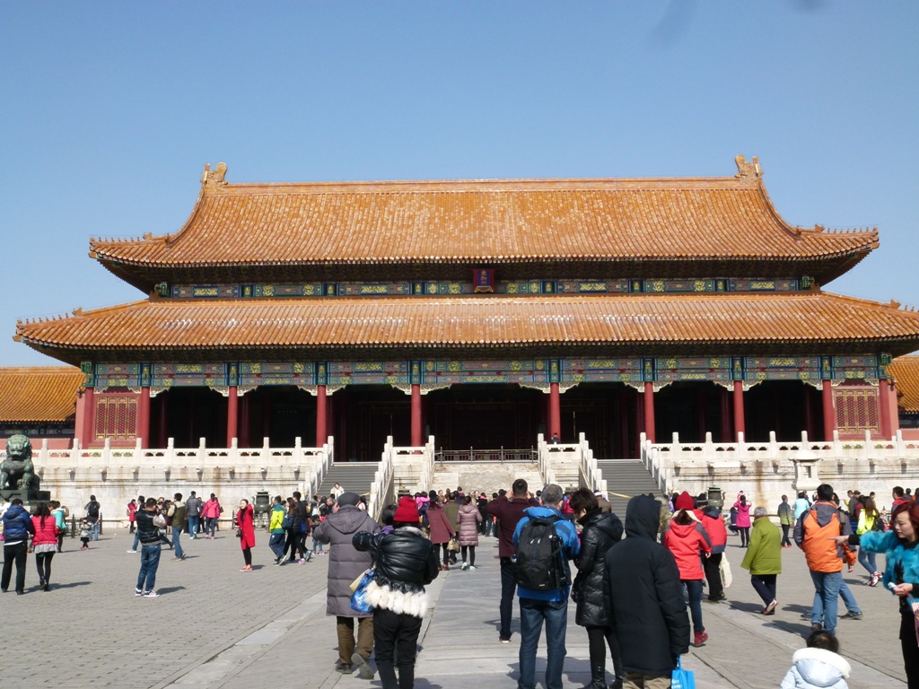故宮博物院は明朝・清朝の皇帝の王宮の南側の(午門)から入ると広場に出ます。そして遠くに重厚感ある城壁の上に聳える太和殿が見えてきます。左右に広がる真っ白な大理石の楼閣が続き、中央には皇帝の歩く石段があって、とても美しい彫刻もみどころです。この石段は立ち入り禁止になっています。太和殿に続く楼閣の天井の煌びやかな色彩で究極の豪華さがうかがい知れます。
