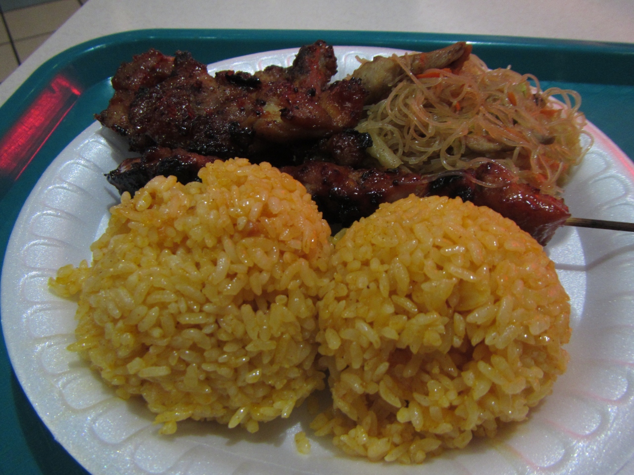 チャモロ風のBBQ、パンシット(焼きそば)、レッドライスを食べました。味はまずまずです。