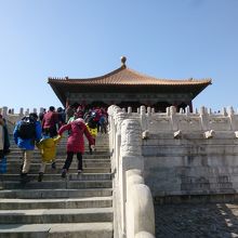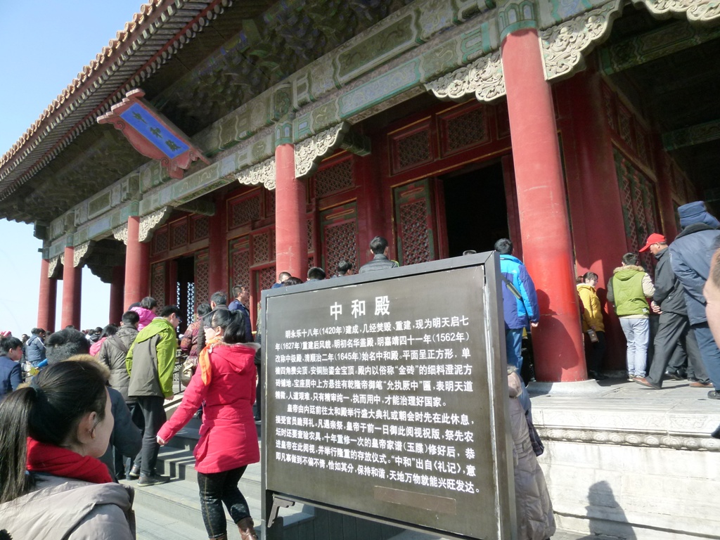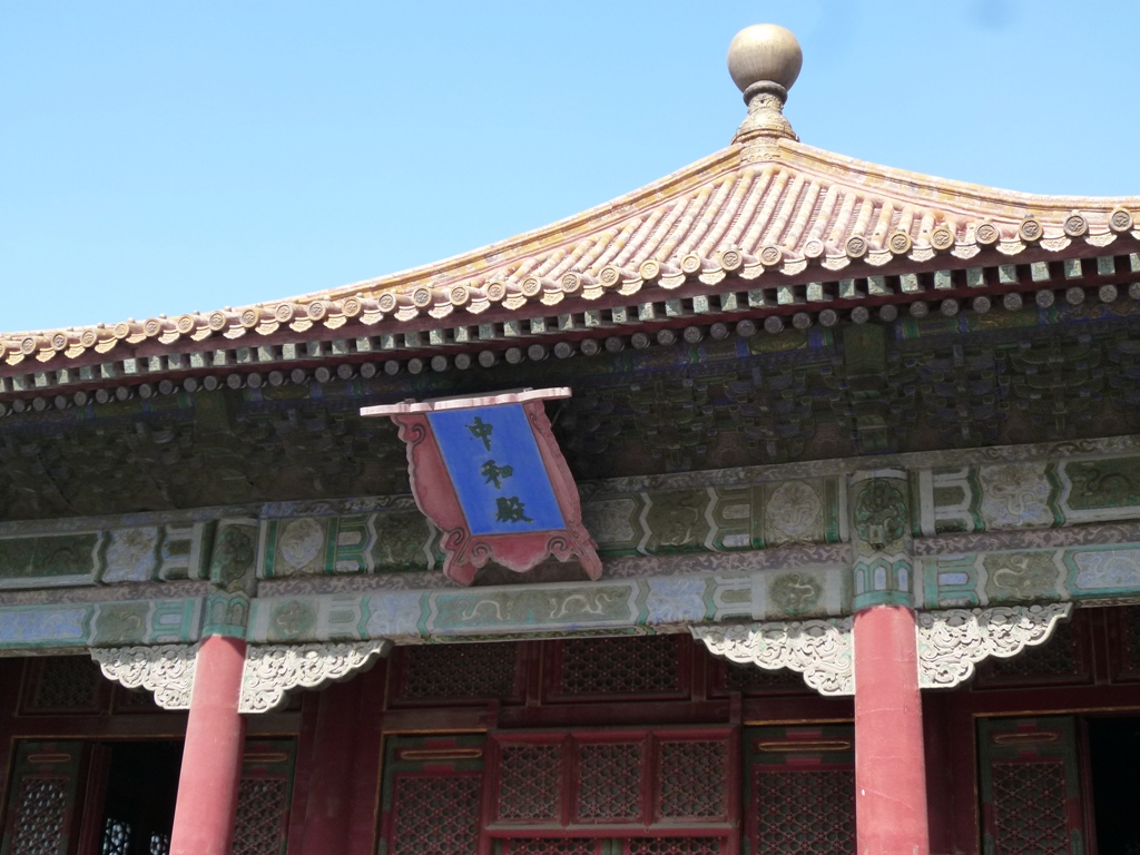 故宮博物院は明朝・清朝の皇帝の王宮の南側の(午門)から入ると広場に出ます。そして遠くに重厚感ある城壁の上に聳える太和殿があって、その奥にあるのが中和殿です。明朝時代に創建され数度の焼失し、現在の宮殿は約390年前に再建されました。太和殿は公式行事など執り行うための宮殿ですが、中和殿は皇帝の休息の場で中は伽藍堂のようでした。