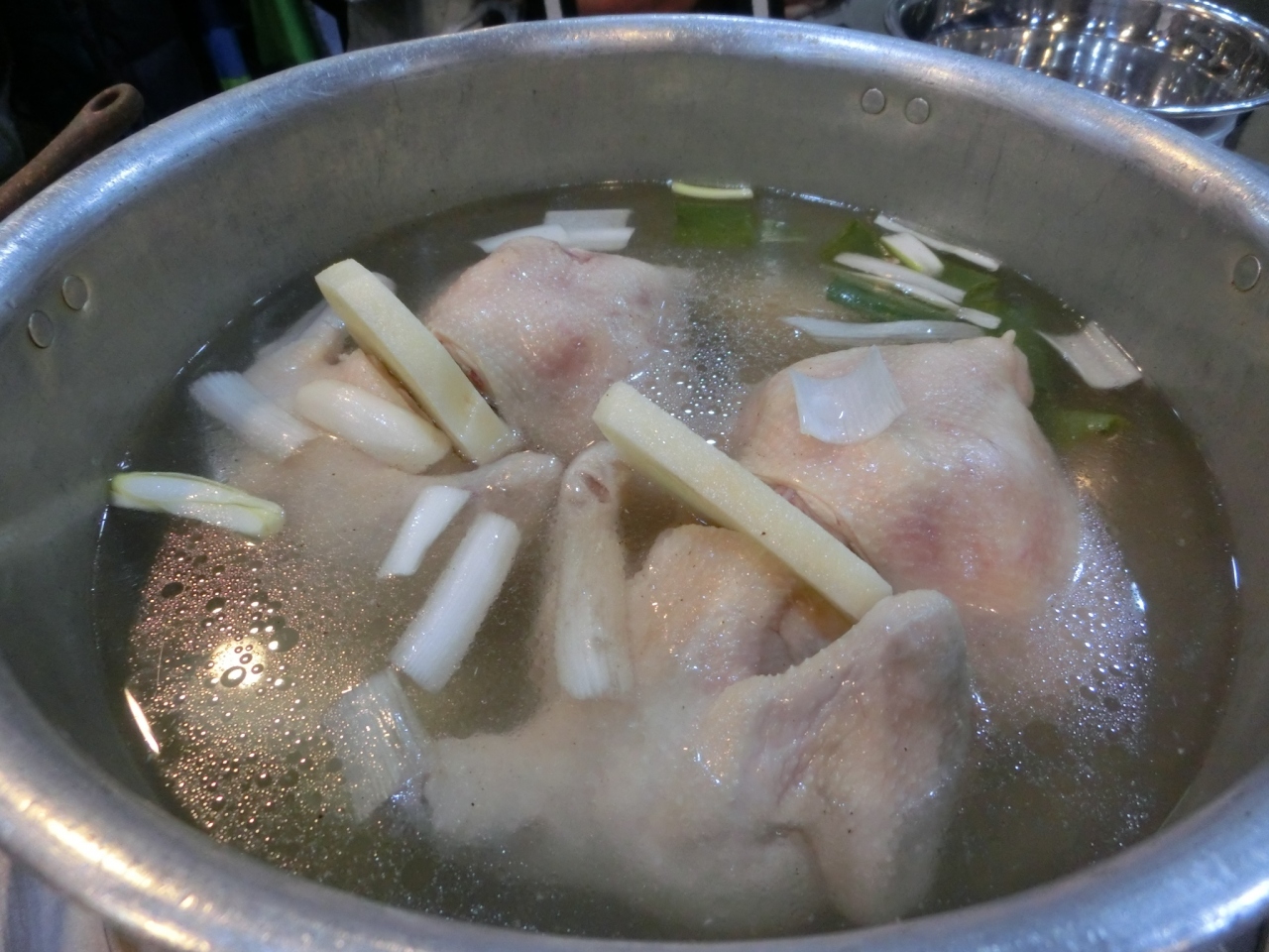 大きな鍋に鶏肉1羽とスープが入っていて、とてもシンプルな料理ですが、鶏肉がやわらかく旨味があって、とても美味しいと思いました。現地の人は、自分でハサミを使って鶏肉を切っていましたが、私たちはどうカットしていいかわからなかったので、店員さんがカットしてくれました。