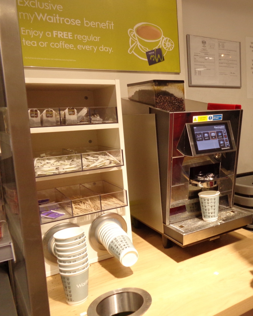 王室御用達のマークがスーパーの袋に印刷されているのがこのウェイトローズ。国内では結構みかけます。ただ、高級スーパーなので利用は限られますが、1日1回コーヒー、紅茶、カプチーノ、ラテのどれかが会員カードを提示すれば無料になるというサービスがあります。