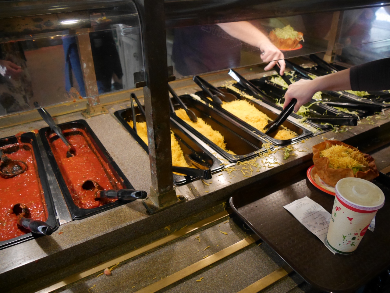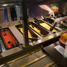 自分で野菜類を盛れるコーナーがあるので、細切りレタス・サク切りトマト・パプリカを盛り、チーズにサルサソースをかけます。