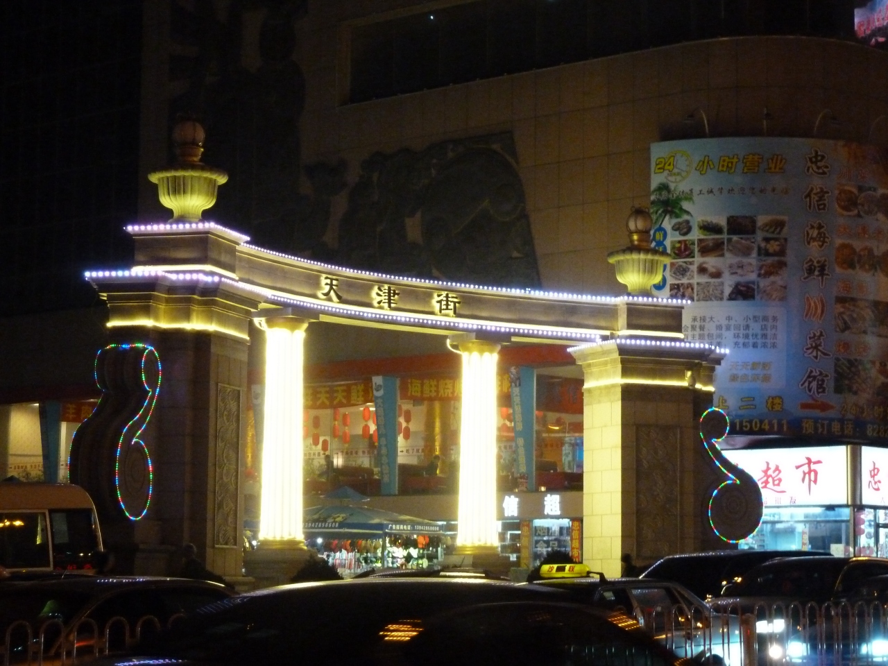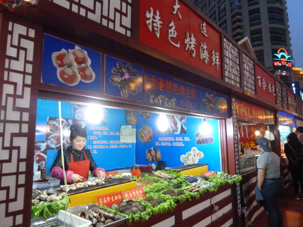 大連駅前なので、ぶらぶらショッピングには、最適な場所にある。商業エリアにあるので、百貨店やスーパーなども近い。天津街には、屋台や海鮮料理店などがある。海鮮料理店では、焼き牡蠣が4つで10元で売られていて、美味だった。