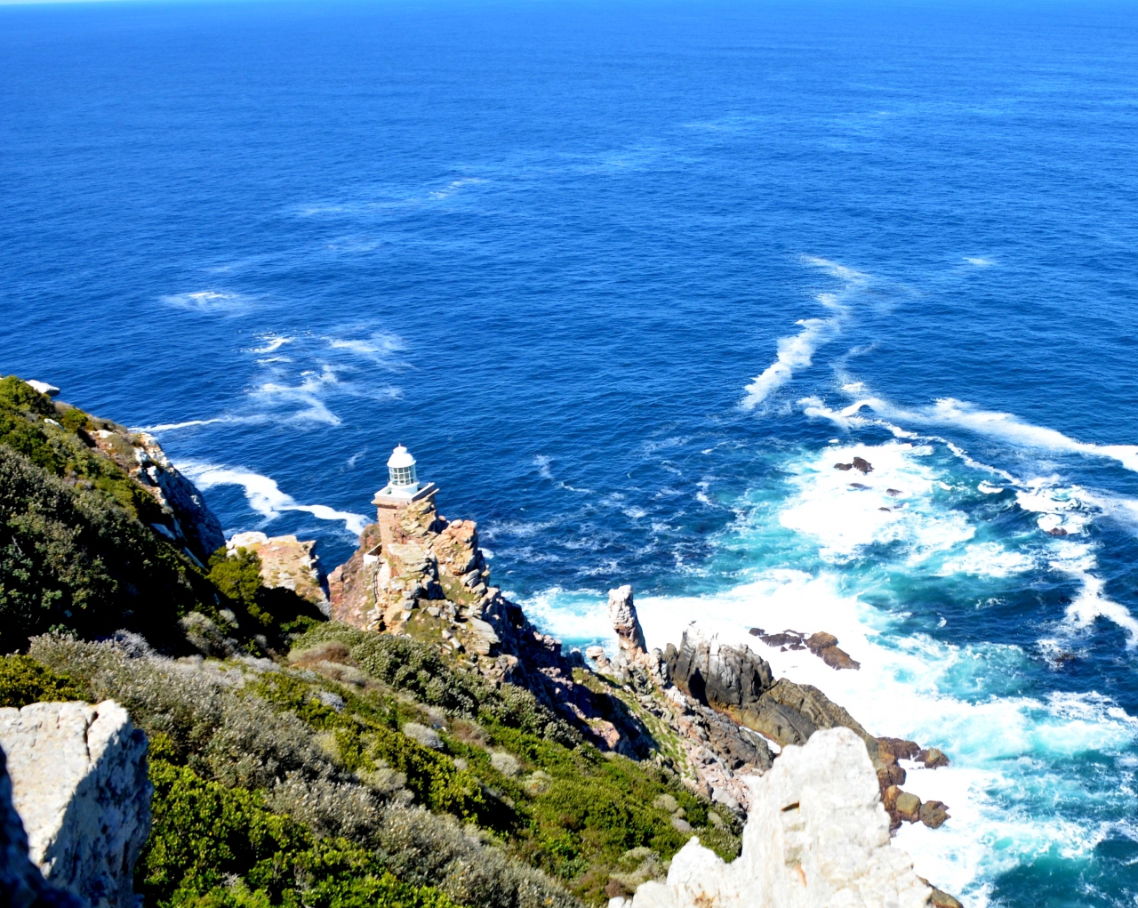 アフリカの最南端は喜望峰だとばかり思っていましたが、実は最西南端の間違いでした。ケープ半島の先端はインド洋と大西洋が分かれる場所、岬も東と西にわかれていて、東がケープポイントで灯台があり、西が喜望峰で岩場の浜辺になっています。ちなみに、アフリカ最南端は、ここから東へ行ったアグラス岬。