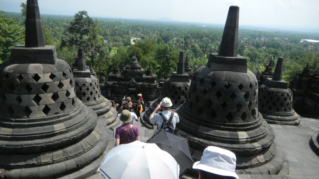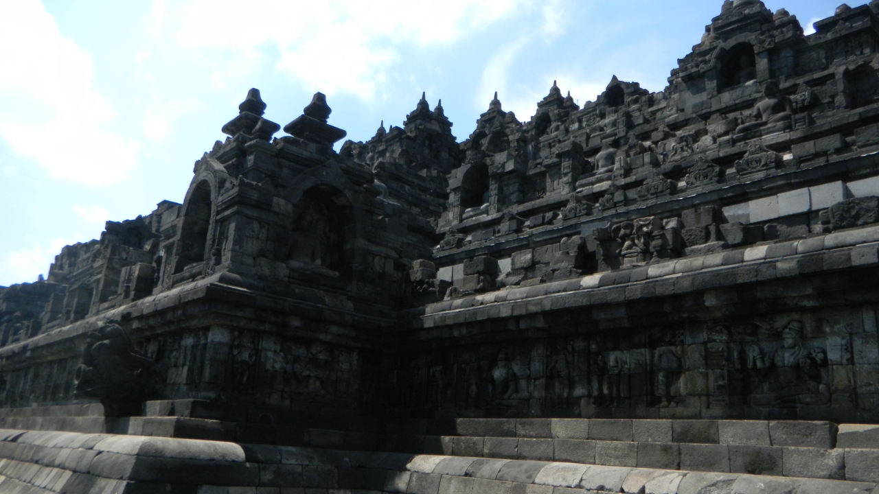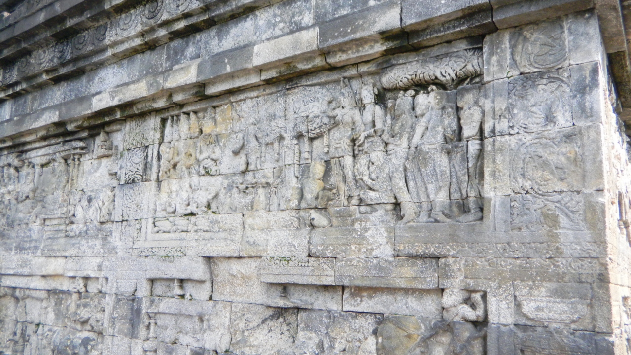 世界遺産登録の中で、最大級の仏教遺跡だとか。仏教を信仰していないのでここが仏教遺跡だと知らなかったのです。日本のお寺とは全然違います。9層からなるピラミッド型で8世紀頃の建造物です。回り方があり、東の入り口から時計回りに回廊を回るのだそうです。回廊のレリーフは男の欲望、女の欲望から始まります。その後は、釈迦誕生から生涯。ラーヤーナ王の物語が描かれています。