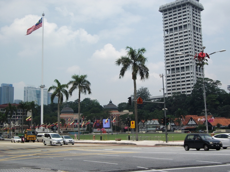 マスジットジャメ見学の後、徒歩で行きました。1957年にイギリスから独立宣言された歴史的広場で国旗掲揚塔の高さは100メートルあり、世界一を誇るそう。目立ちます!周りを取り囲む洋風の歴史的建造物と芝生がきれいです。