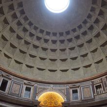 パンテオンの天井には、オクルスと呼ばれる、ラテン語で"目"を意味する穴が開いています。 この穴の部分はガラスか何かでカバーがされていると思っていたのですが(何か落ちてきたら危険だし)、昔のまま穴が開いた状態で保存されています。 この開口部の真下部分にはロープで囲いがしてあって、雨が吹き込むので床がビショビショでした。