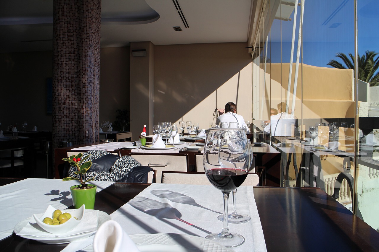 レストランの入り口の反対側は崖になっていて、正面に地中海、眼下にカラオンダ・ビーチ、そして「ヨーロッパのバルコニー」が望める。この眺望を真横に見られる席は限られているが、オフシーズンなら少し早めに行っておけば確保できそう。オンシーズンは取り合いになるかもしれないが、全面ガラス張りのため、この席に座っていると冬でも日差しがあると次第に暑くなってくるほど。なので二列目の席ぐらいの方がちょうどいいかもしれない。