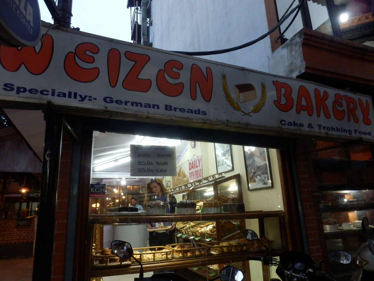 カトマンズゲストハウスから南へ歩いてすぐの場所にあるドイツパンのお店です。この周辺にはパン屋さんが数軒あり、閉店近くなるとディスカウントされるのですが、こちらのお店は夜8時半からパンは50%オフ、ケーキは25%オフになります。バナナの入ったシフォンケーキを買いましたが、バナナの風味が強くて美味しかったです。