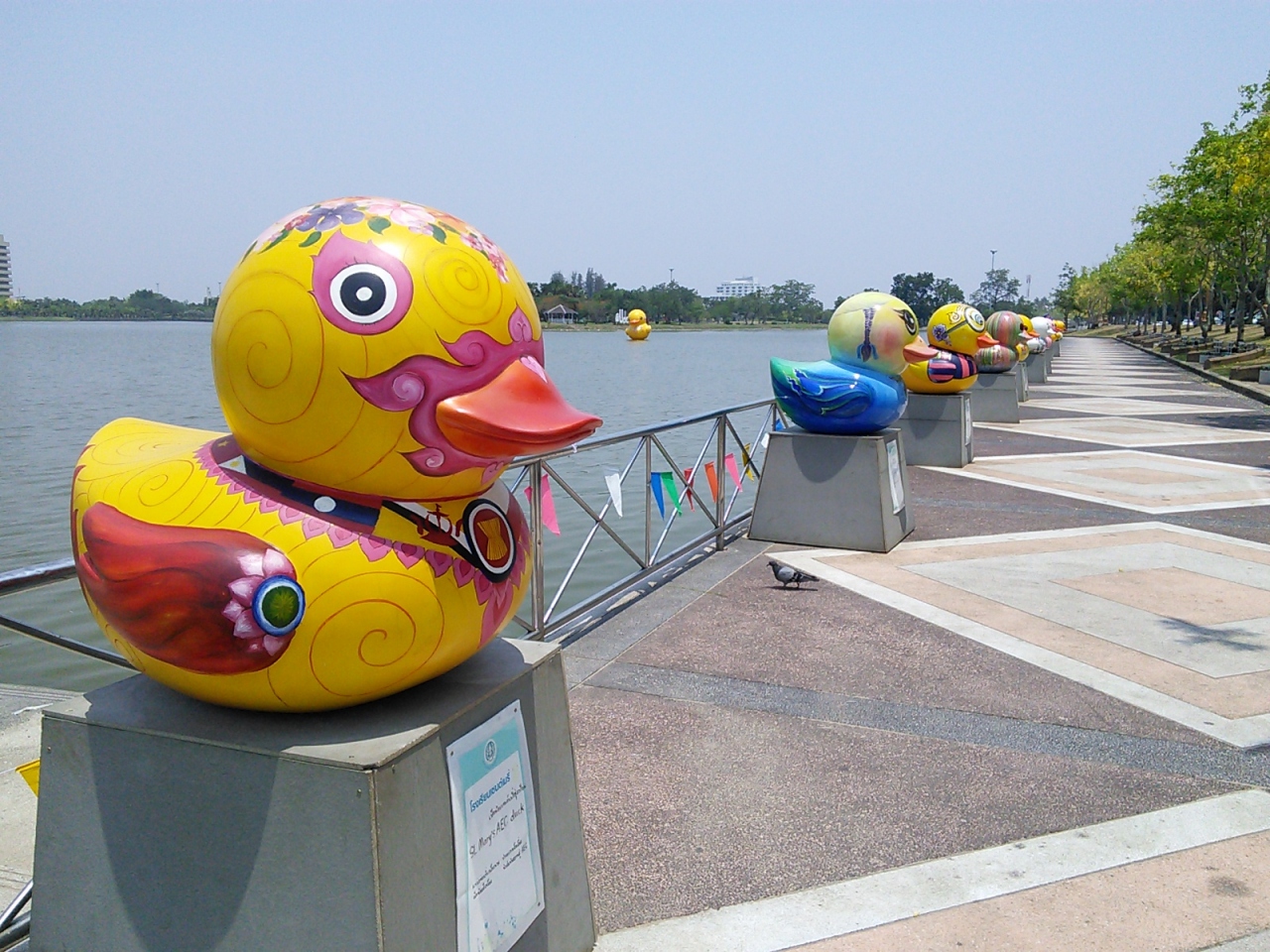 ウドン名物?の“アヒルちゃん”を見に行きました。市長の鶴の一声で公園の池に現れたアヒルちゃん。当初は中に空気を入れた巨大なバルーン状のものだったようですが過去に強風で飛ばされ大破。その後、紆余曲折あり現在は小っちゃなものが一羽浮かんでいます。遠くからなのでよくわかりませんがプラスチック製のようにも見えました。