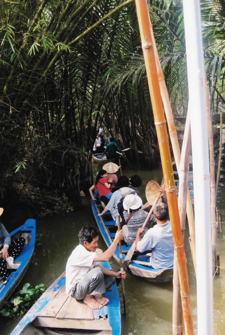 手漕ぎボートに乗りこみ、ジャングルチックな中をすいすいすすんでいきます。ツアーだとクルーズの他に南国フルーツの試食があったり、蛇を首に巻いてみたり?名物エレファントフィッシュが食べられたり、盛りだくさんで楽しめました。