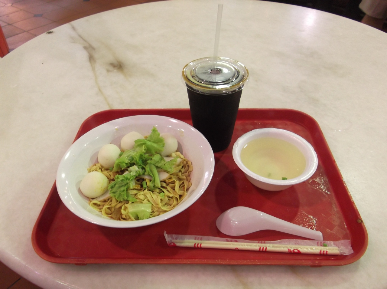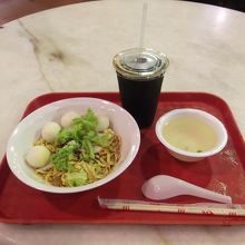 私が注文したのは松記麺食のフィッシュボールヌードル。魚のつみれが乗った汁無し麺とあっさり味のスープのセットで、汁無しでそのまま食べても良いし、スープをかけても美味しいです。