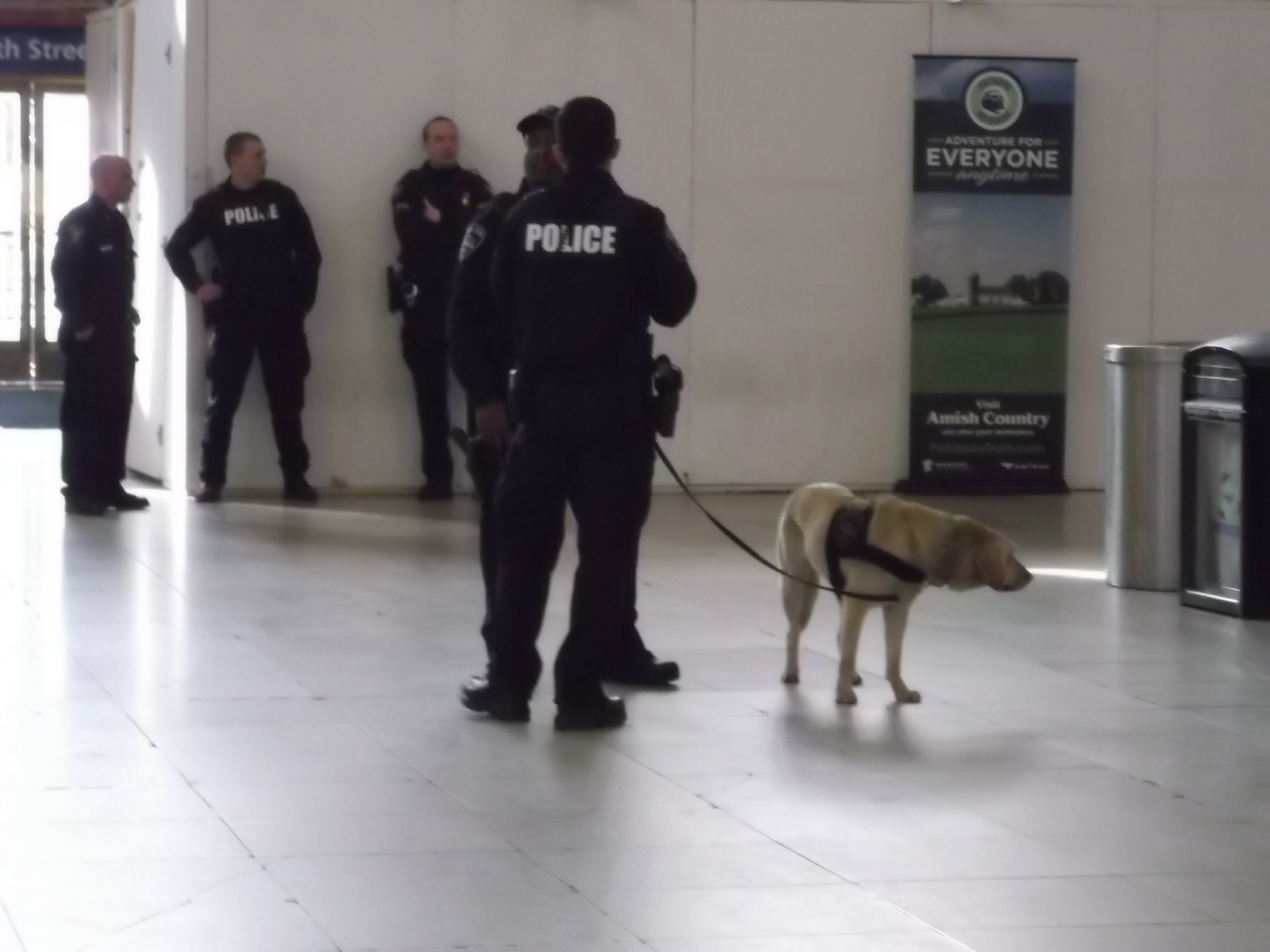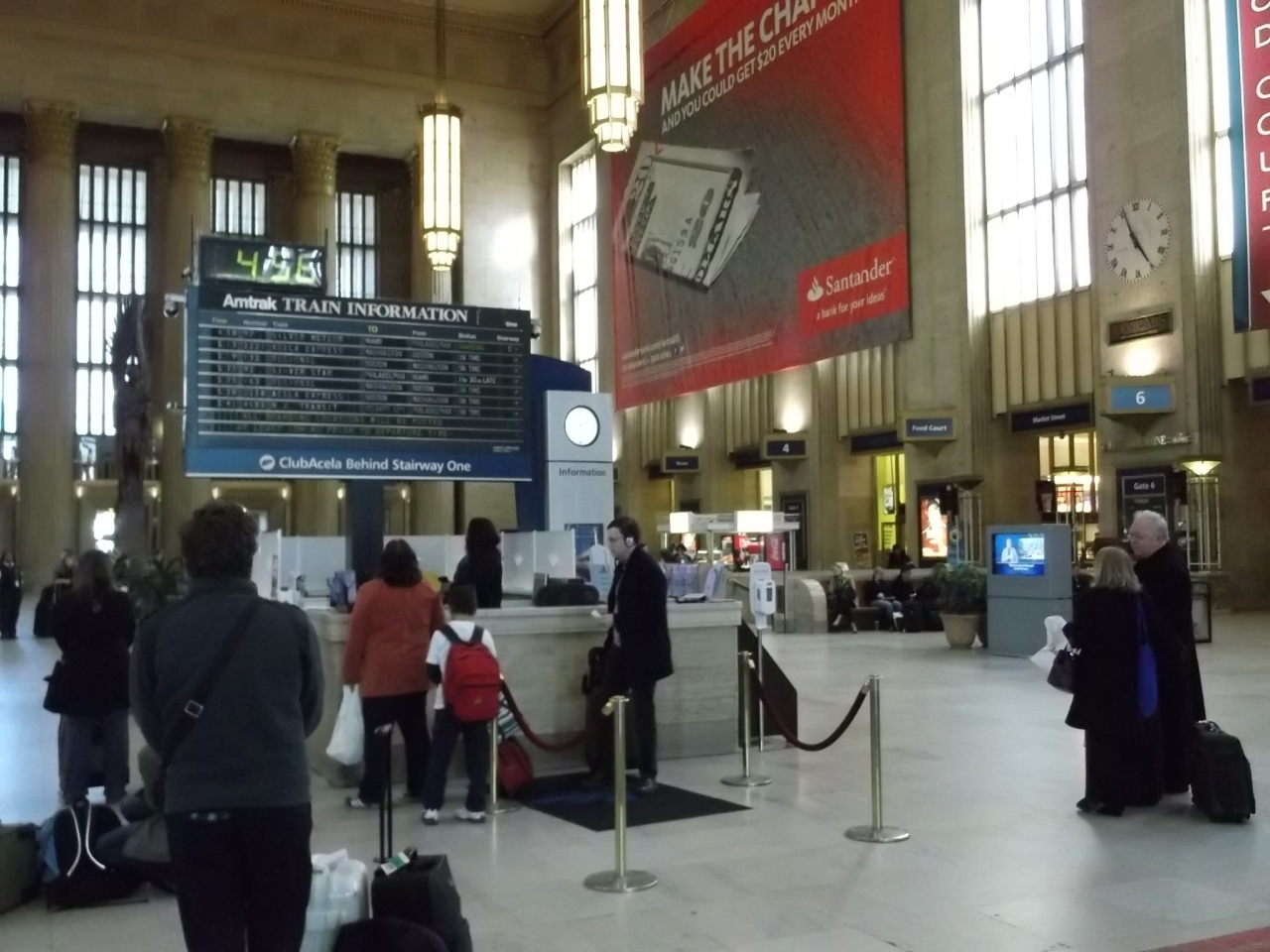 フィラデルフィアからDCまでAMTRAKで移動の為待ち時間を過ごしました。立派な建物で、日本には無い規模の大きさ(アメリカ本土は今だかつて爆撃を受けたことが無いので、アメリカの栄華を誇る建物が沢山ある。)ホールの中央に時刻表があり、階下のホームに通じるエスカレーターが3つ(?)あり、8時30分AMTRAK○○便に乗る人はGATE△で待ちなさいとアナウンスがあり、そこへ係員が来てエスカレーターを始動指せ、乗客をホームへと降ろして行きます。切符はそこで確認するだけ、間違えて並んでいる人には、あっちへ行きなさいと指示します。