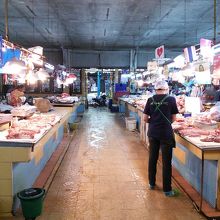 チャルン・ムアン通りのビン川と鉄道駅の中間にあります。通りからは少し奥まった場所にあるのでちょっと分かりにくいです。入口付近には衣料品が少し、麺類やぶっかけ飯が食べられるスペースもあります。なぜだか壁で囲まれたエリアがありそこが肉や魚介の生鮮品売り場になっています。奥側が野菜、果物売り場。