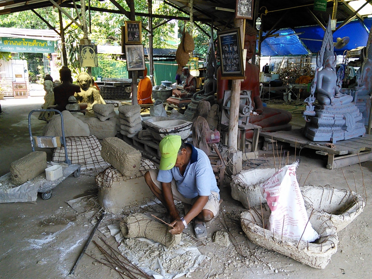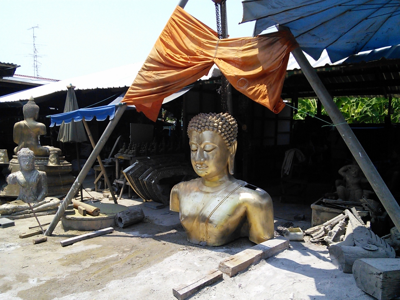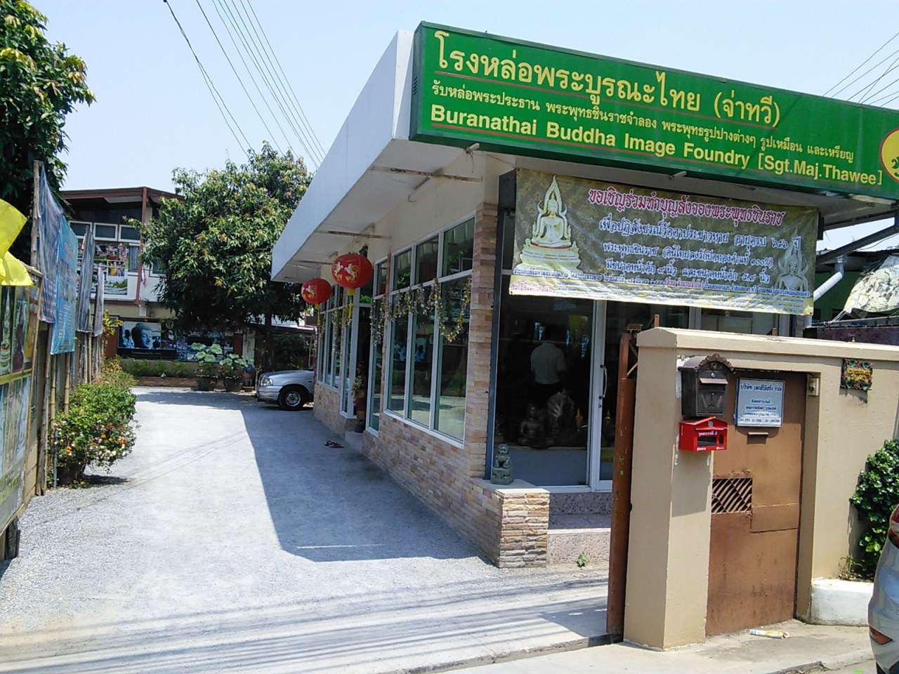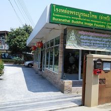 ターウィー民俗資料博物館の先50mほど行った左手にあります。入口だけ見ると鋳造所のような雰囲気はないので緑色の「Buranathai Buddha image Foundry」と書かれた看板を目印にして下さい。
