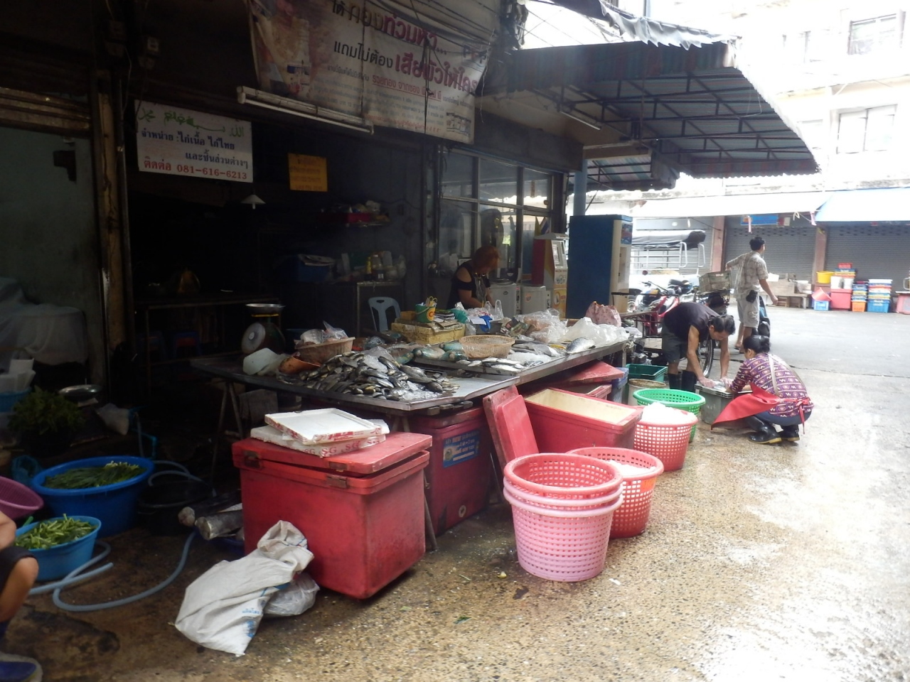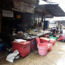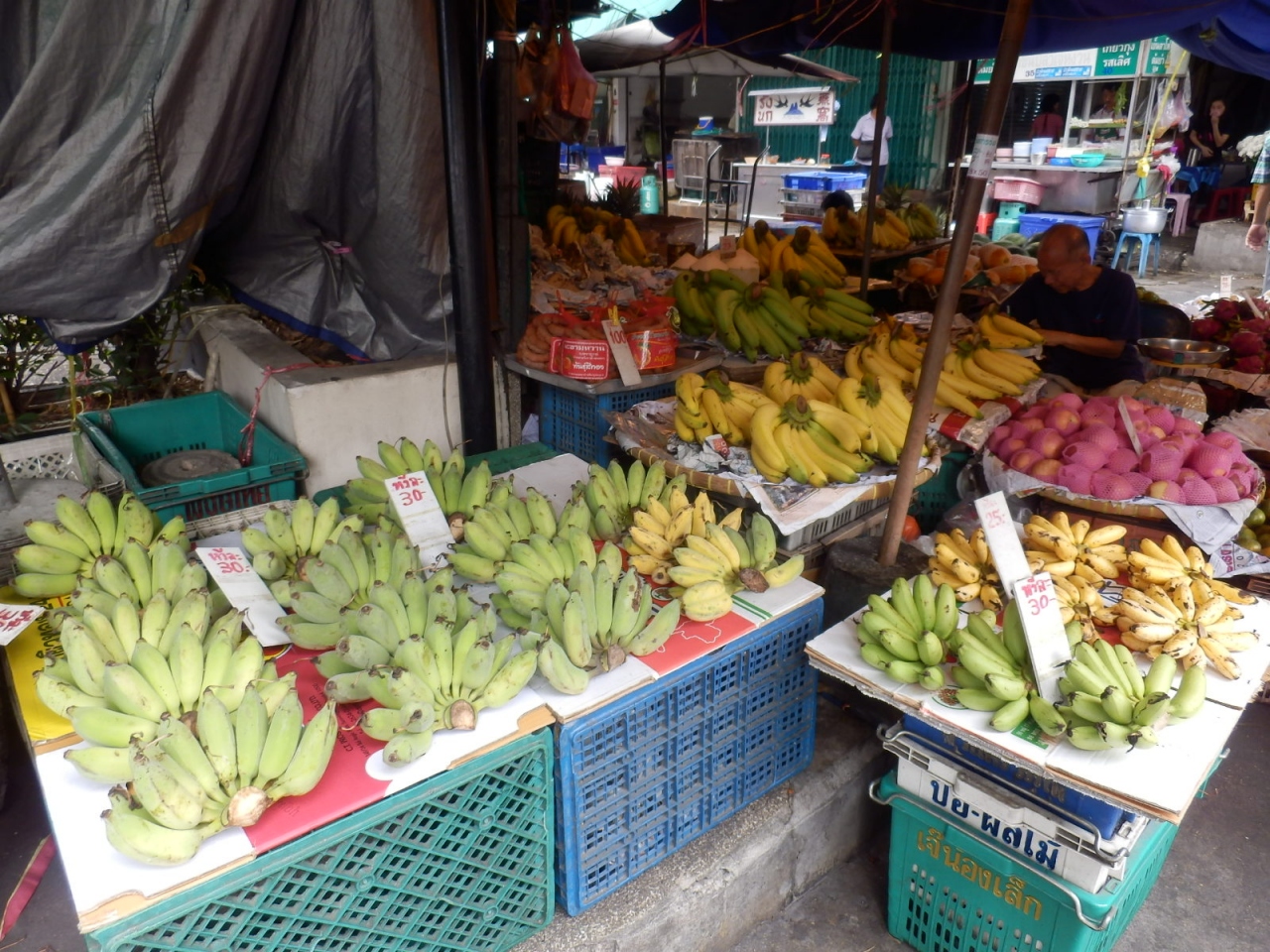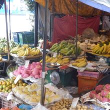 BTSのサパーンタクシン駅を降りて、チャオプラヤ・エクスプレス乗り場とは反対側、大通りを北へ歩いて数分の場所で見つけた市場です。ロビンソンデパートの近くにテントが並んでいて果物などが売られていました。奥へ進むと、大きな建物があり、野菜などの市場がありました。残念ながら休日の昼間に訪れたため、建物内は静まり返っていましたが、平日の朝に訪れると活気ある市場の雰囲気が味わえるかもしれません。