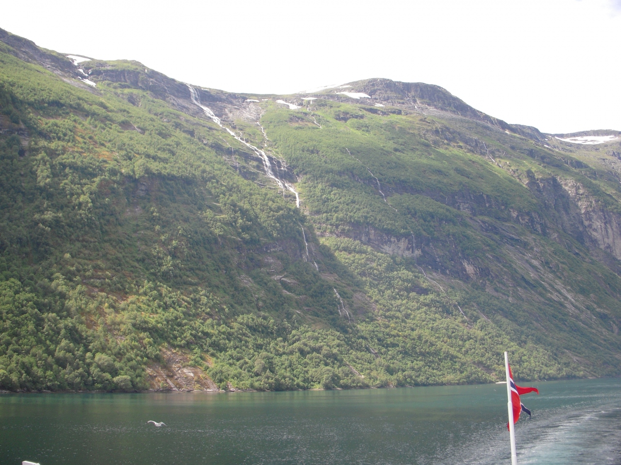 クルーズでは、山頂に氷河を戴く山々や、標高1200m級の切り立った断崖絶壁が両側に迫り、「花嫁のベール」と名付けられた滝、「七人姉妹」と呼ばれる7筋の滝や酒瓶の形にも似た「求婚者の滝」などが見どころです。