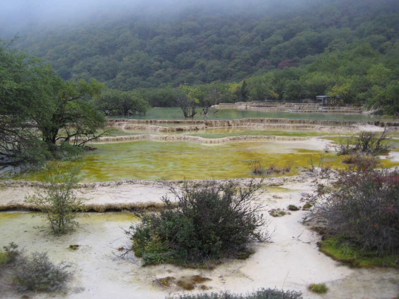 黄龍風景区の一番上、標高3553mに美しい光景が広がる。登って行くと感動が更に大きい。あいにく天気が悪く霧雨だったが霧の中に顔をのぞかせる風景も美しかった。朝一で入り口に行き当日一番乗りで五彩池に到達したのでだれもまだいなくて神秘的な感覚を味わえた。