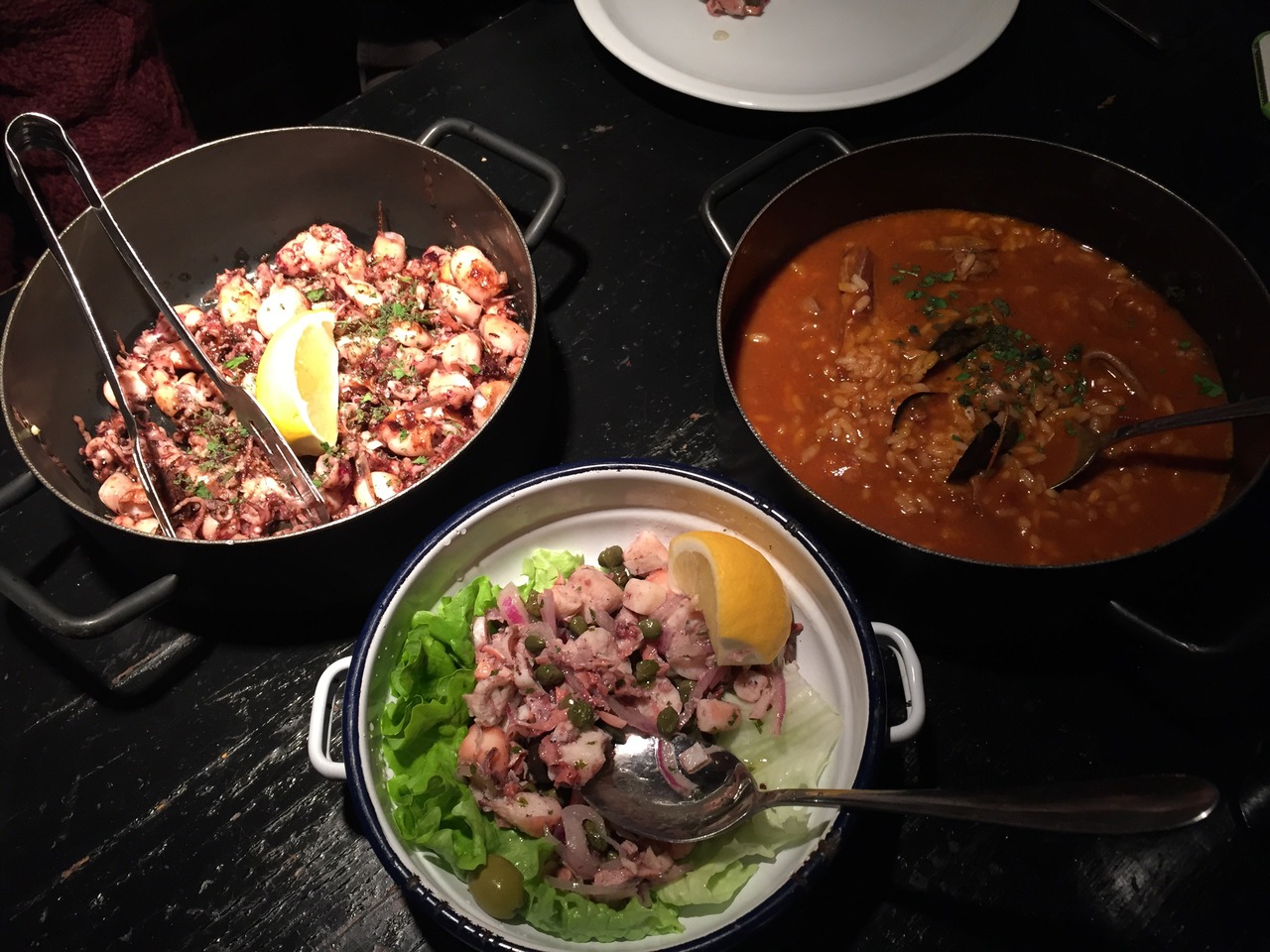 タコのサラダ、ケッパーが効いてて美味しい。小さなイカのグリルも、ちょっとキモの味がしてなかなか。残念だったのはシーフードリゾット。トマト味が強すぎて、シーフードの味が良くわからなかった。