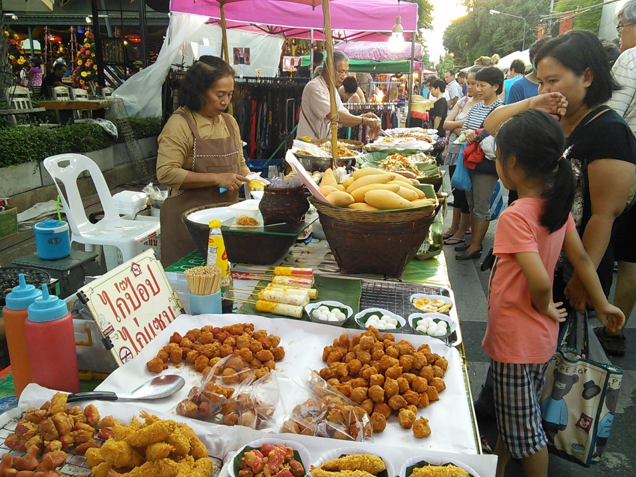 日曜日の夕方からターペー門から西側にのびるラチャダムヌン通り一帯で開かれるナイトマーケットです。途中交差する道や路地、寺の境内にも店が出るのでかなり広範囲で大規模です。旧市街の中心部に当たるためやって来る客の数も半端ないです。売られているものは観光客用の土産物や簡単につまめる食べ物がほとんどです。どこにでも売られているようなド定番のコテコテなものからアーティストが作るオンリーワン的なものまで様々で以外に安く買えるものもあります。お土産を何にするか迷っている人にはとても重宝するマーケットだと思います。